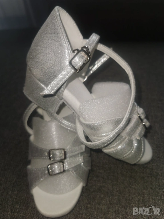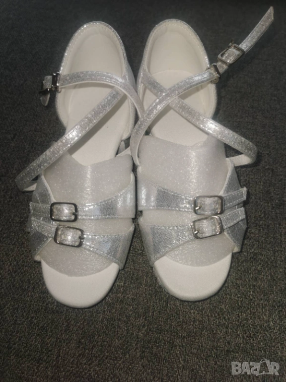 Момичешки блестящи бели обувки за Латиноамерикански танци - мека подметка, противоплъзгаща, закопчаване с катарама, ребриста текстура, перфектни за балнаи танци, за вътрешна употреба, удобство за всеки сезон. Дължина на станалото 17 см.Закупени чисто нови 120лв.но за съжаление са ни малки!