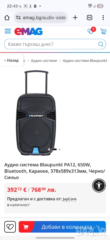 Аудио система Blaupunkt PA12, 650W, Bluetooth, Караоке, → Обява 53448141