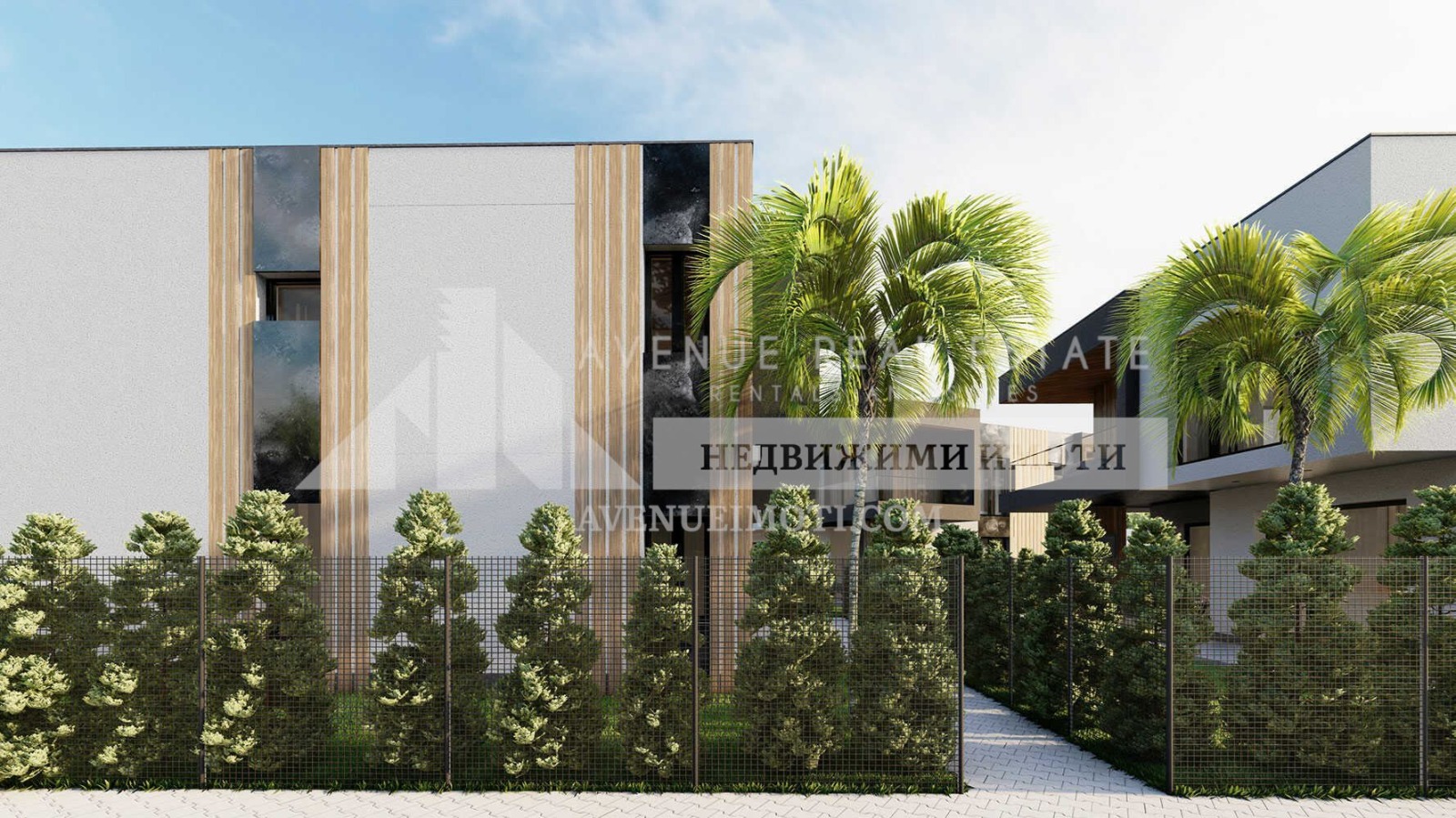 Богато озеленяване с палми, зелени общи площи и алей.