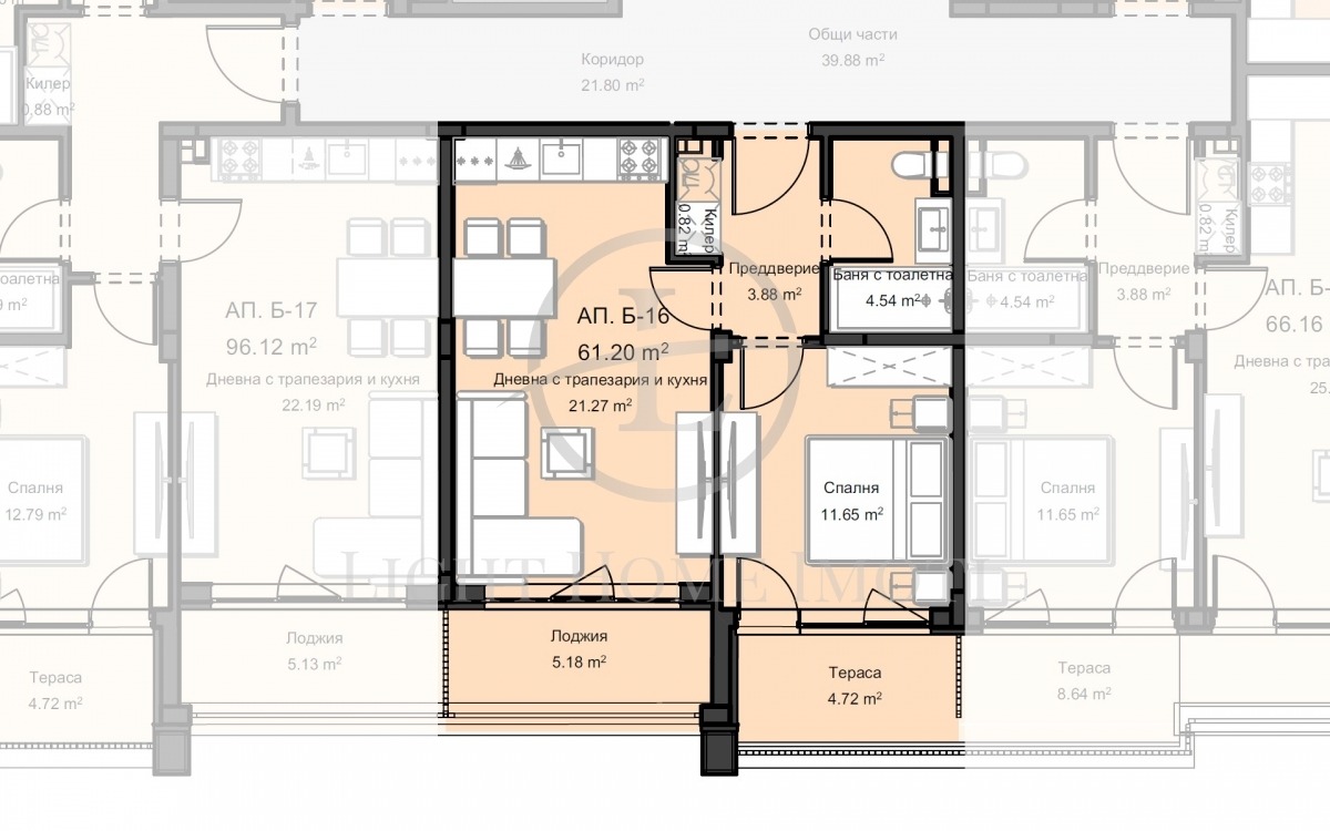 - Разпределение: Просторен и светъл хол с кухненска част , голяма спалня, баня с тоалетна, входно антре, перално-склад и тераса. Към апартамента има прилежащо избено помещение.