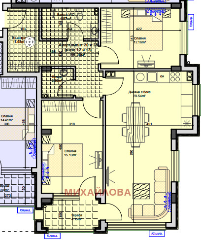 Апартаментът е на четвърти етаж, със застроена площ 120 кв.м. Състои се от дневна - с кухненски бокс, две спални, коридор, баня с тоалетна и килер.
