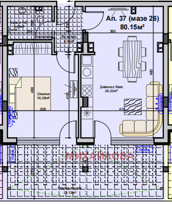 Апартаментът е на пети етаж, със застроена площ 100 кв.м. Състои се от дневна - с кухненски бокс, спалня, коридор, баня с тоалетна и мазе.