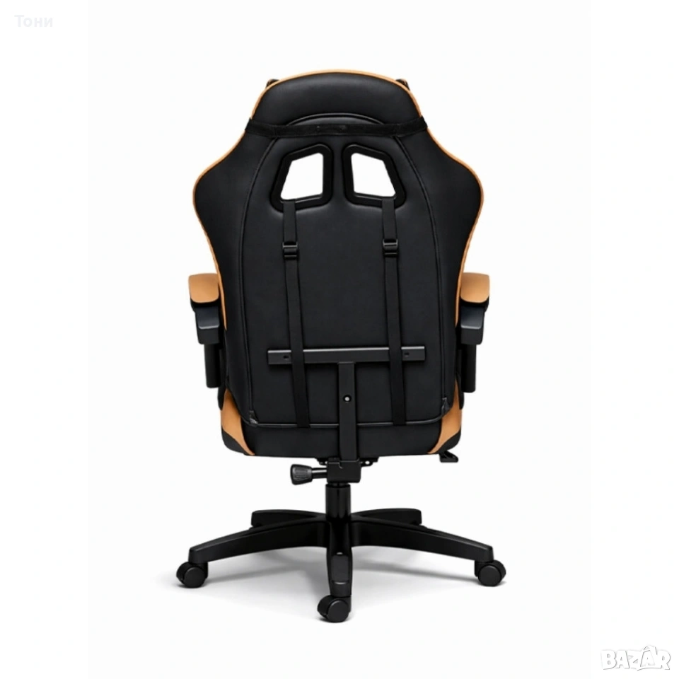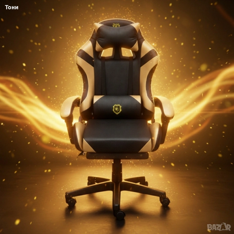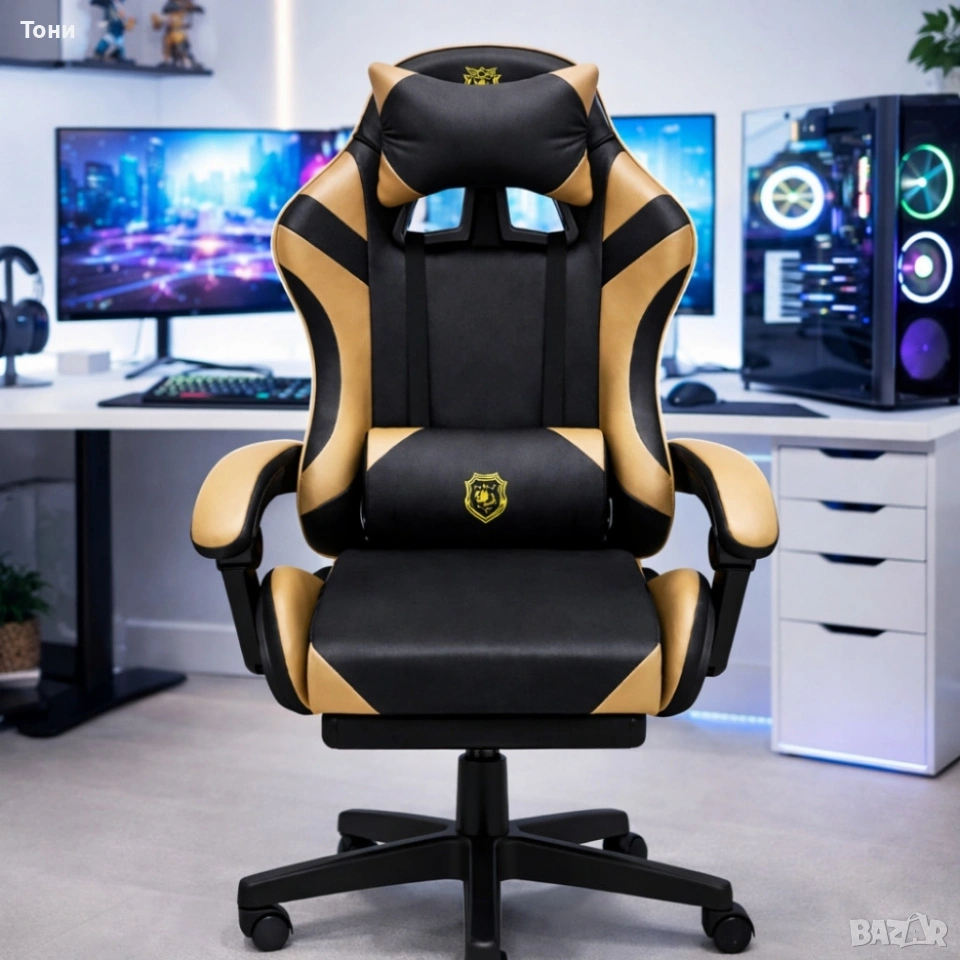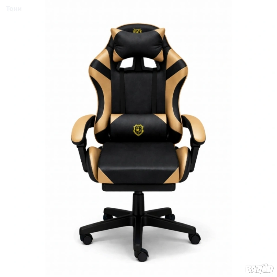 Геймърски стол с масажна функция, лумбална възглавница и поставка за крака – Черен-златист → Обява 53448895