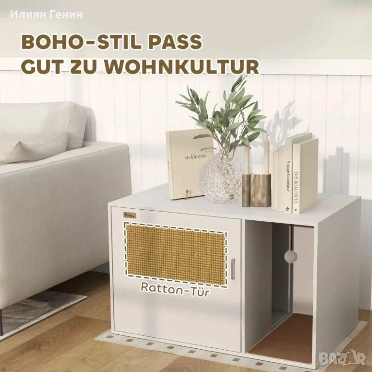Бохо-шик: Шкафът за котешка тоалетна в модерен бохо стил с ратанова врата разкрасява вашия декор и същевременно предлага дискретна тоалетна за вашата котка.