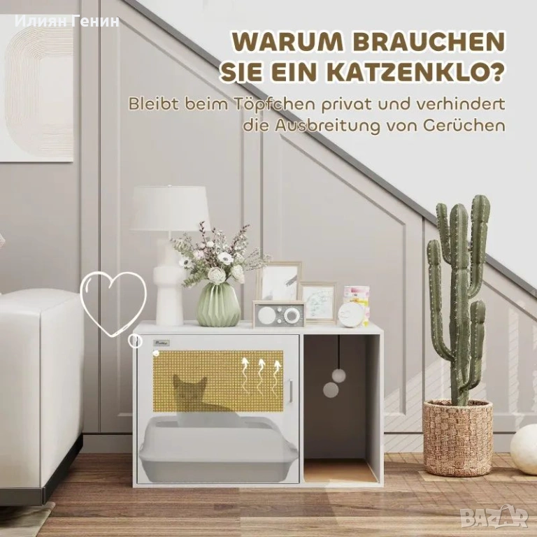 Контрол на миризмите: Този шкаф за тоалетна е специално проектиран да осигури на вашата котка лично пространство, където да извършва дейностите си, и ефективно помага за ограничаване на миризмите. Подходящ е за повечето тоалетни и допринася за по-свежа среда на живот.
