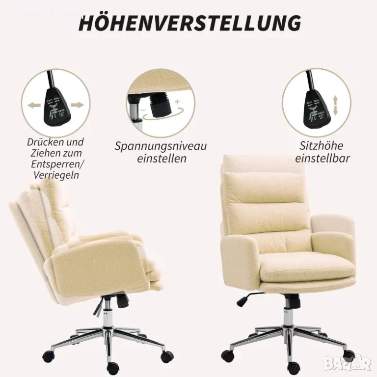 Офис стол HOMCOM, тапициран стол за бюро, функция накланяне, въртящ се, подвижен, кремаво бял - 155.00€