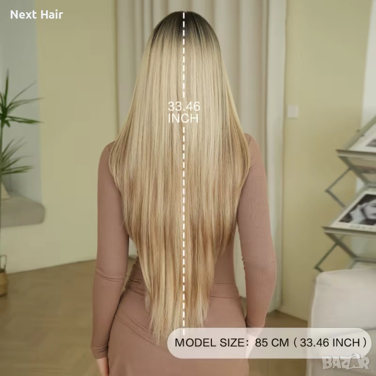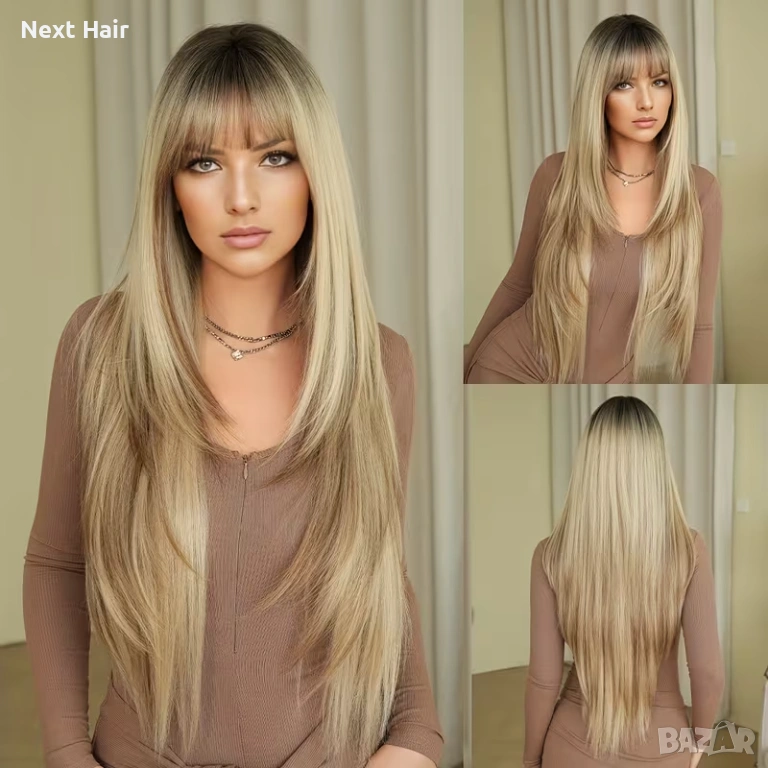 Елегантна дълга права перука с дължина 85 см в стилен микс от русо с фини кафяви кичури и естествен омбре ефект с тъмни корени. Прическата създава дълбочина, обем и естествено преливане на цветовете, което придава модерна и впечатляваща визия.