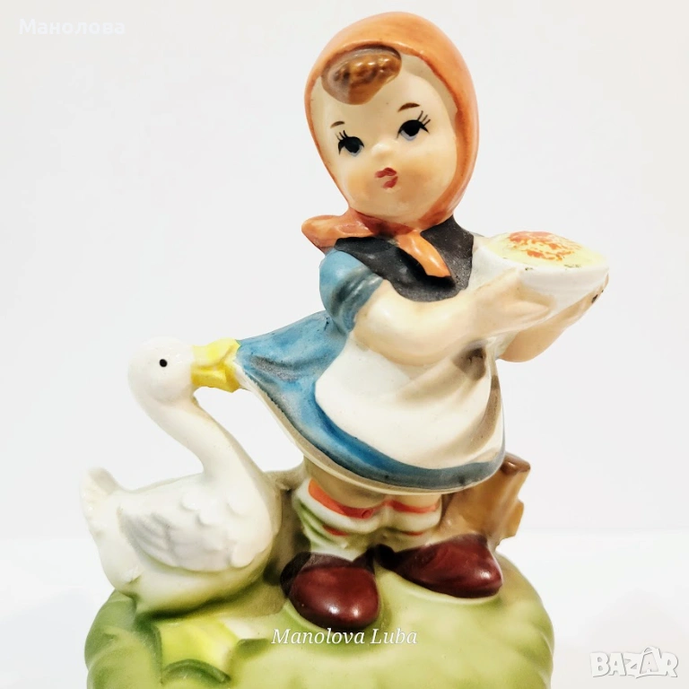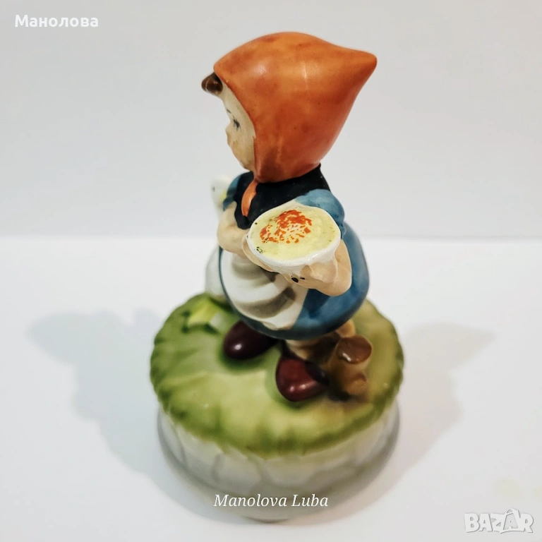 Винтидж музикална кутия в стил Hummel Момиче с пай и патица, произведено в Япония.