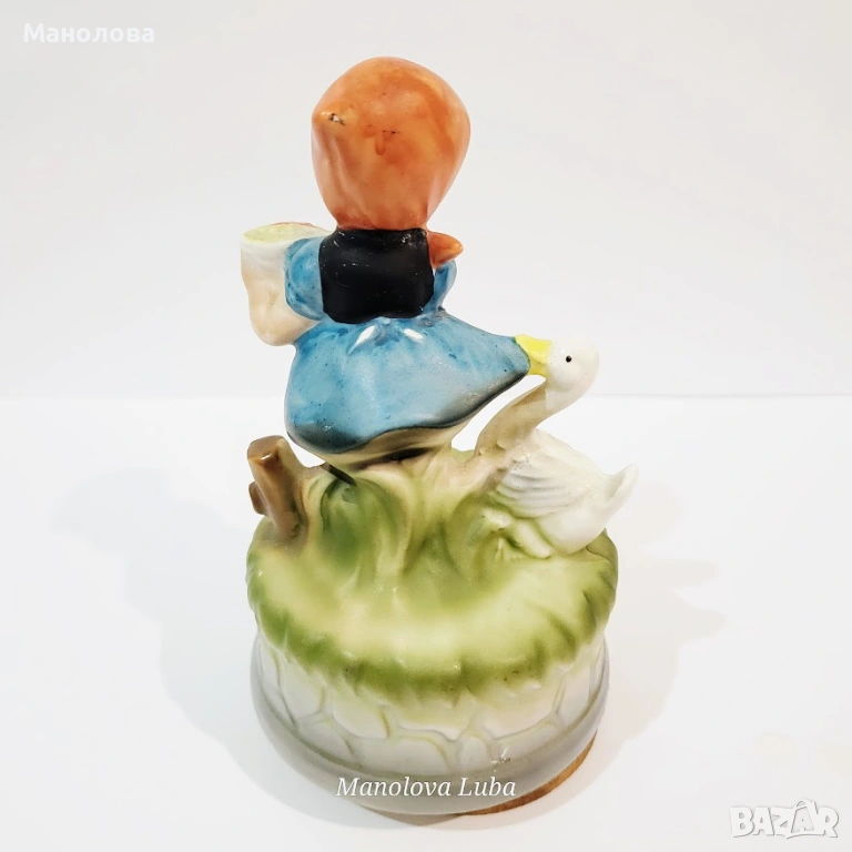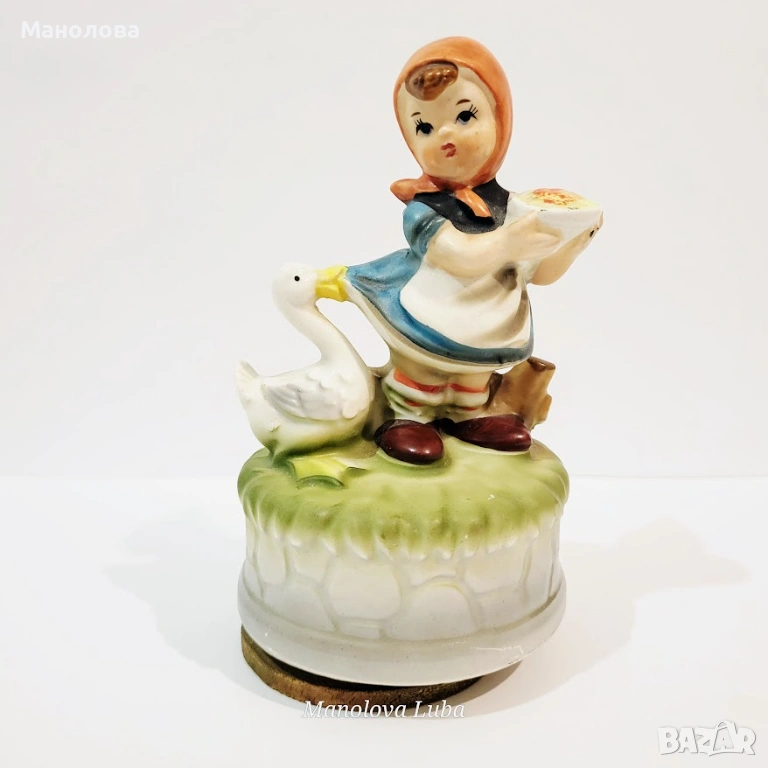 Винтидж порцеланова музикална кутия с латерна "Момиче и патица". Фигурката се върти, работи чрез завъртане на основата и възпроизвежда мелодията "Love Story". По мои проучвания е произведена 50те години на миналия век. В много добър антикварен вид, няма чипове и наранявания. Латерната работи. Рядка колекционерска находка!