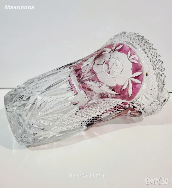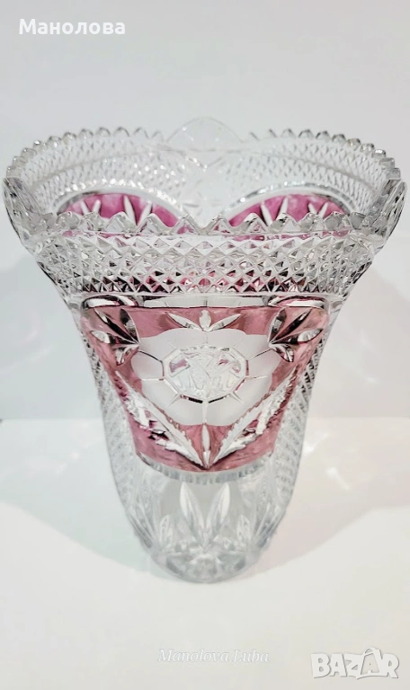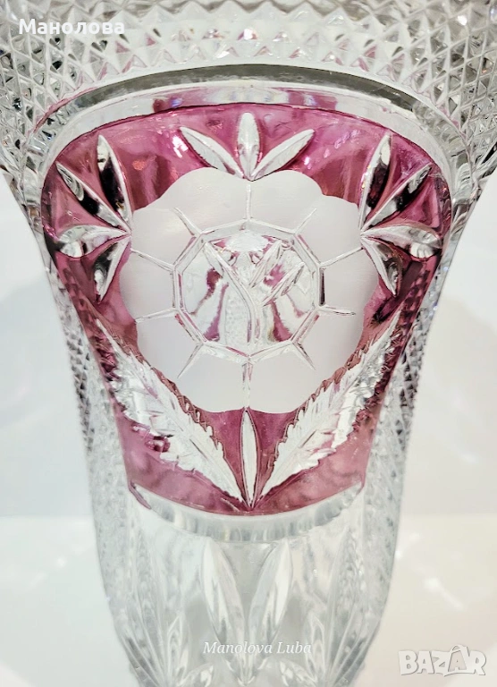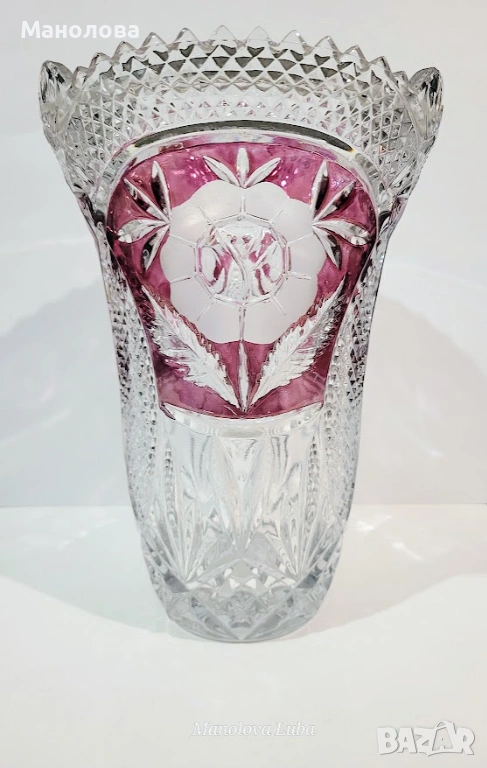 Голяма винтидж кристална ваза с розов отблясък, с панели отстрани и гравирани декорации от цветя и листа. В отлично състояние, няма чипове и наранявания.