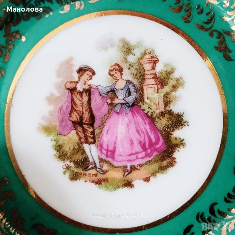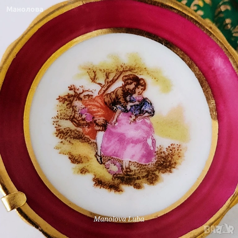 Миниатюрни порцеланови чинии за къща за кукли Limoges France, с декорация, изобразяваща двойка в пасторална сцена по сцени от Фрагонар.