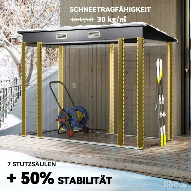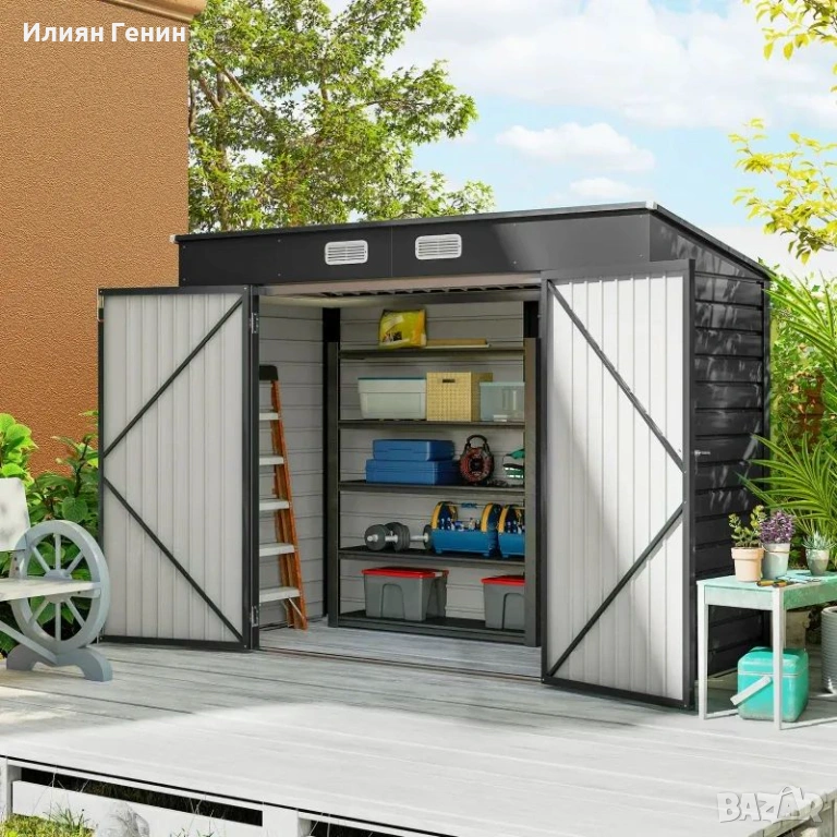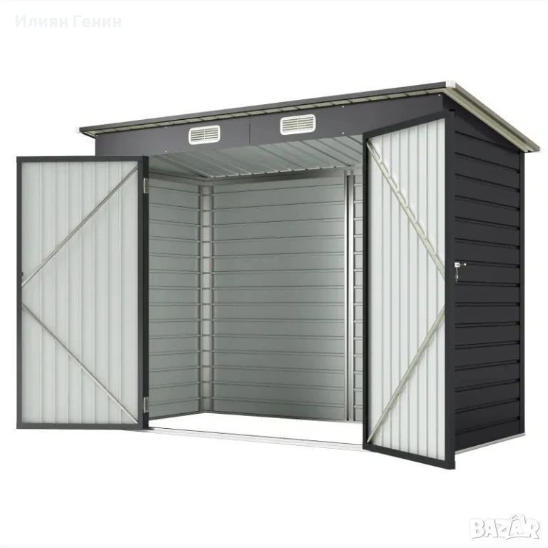 Градински навес от стомана: Поцинкованата стоманена конструкция на този градински навес осигурява здравина и стабилност, идеален за употреба на открито. Защитете безопасно вашите градински инструменти и оборудване от атмосферните условия.