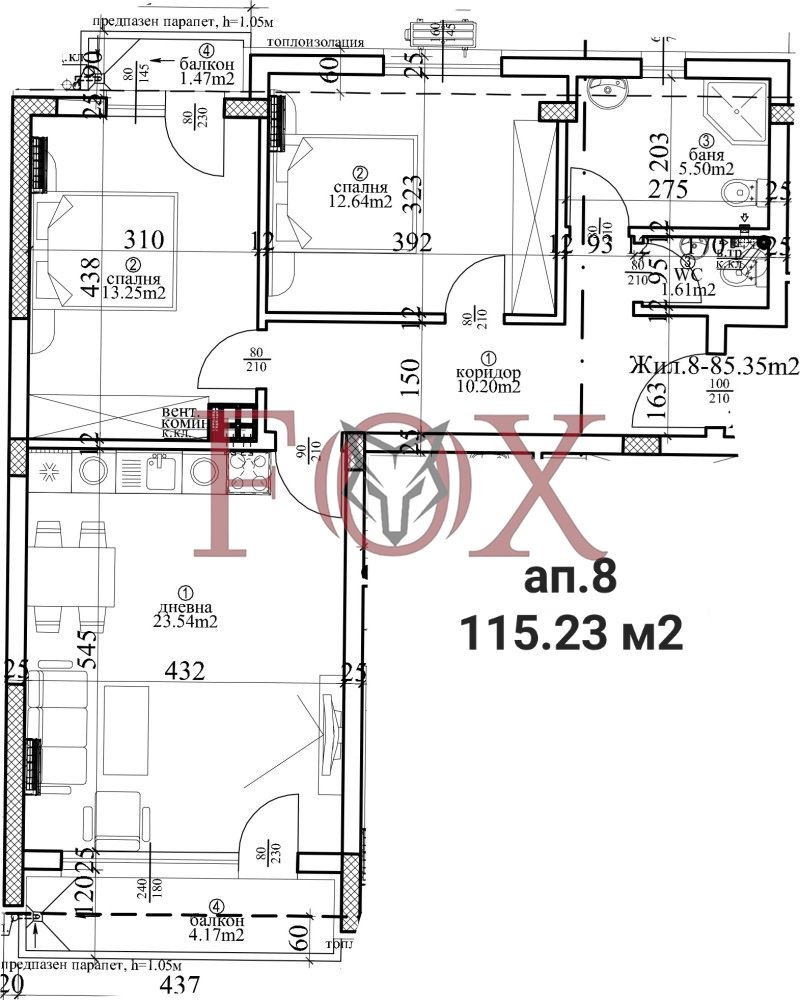 Разпределение:Входно антре,дневен тракт с кухненски кът ,две спални ,баня с тоалет,тераса.