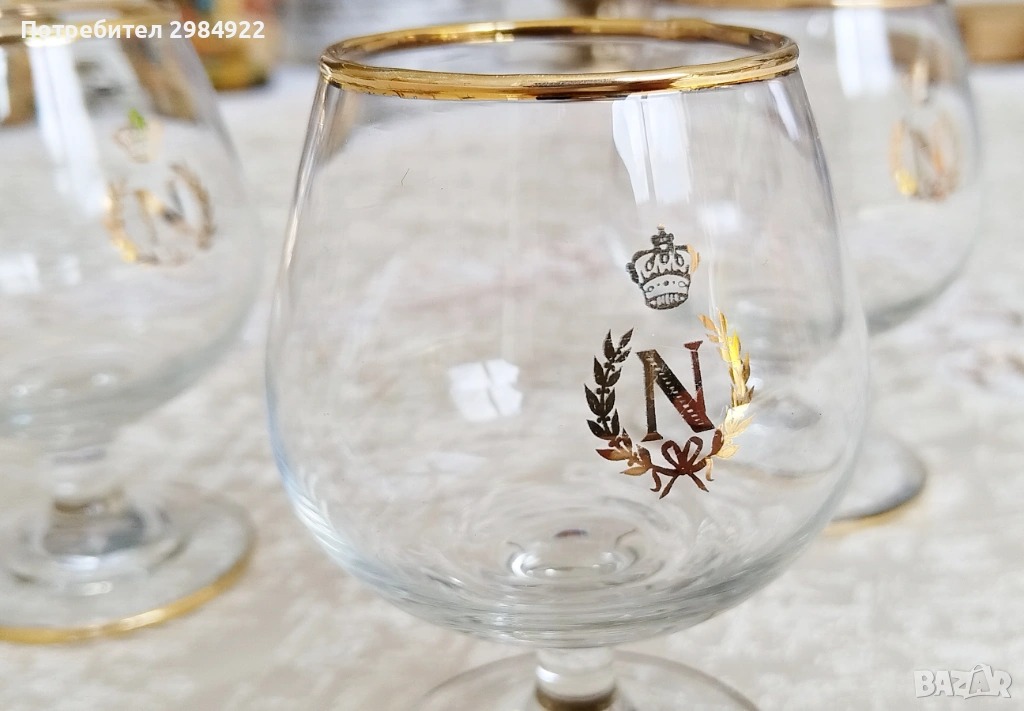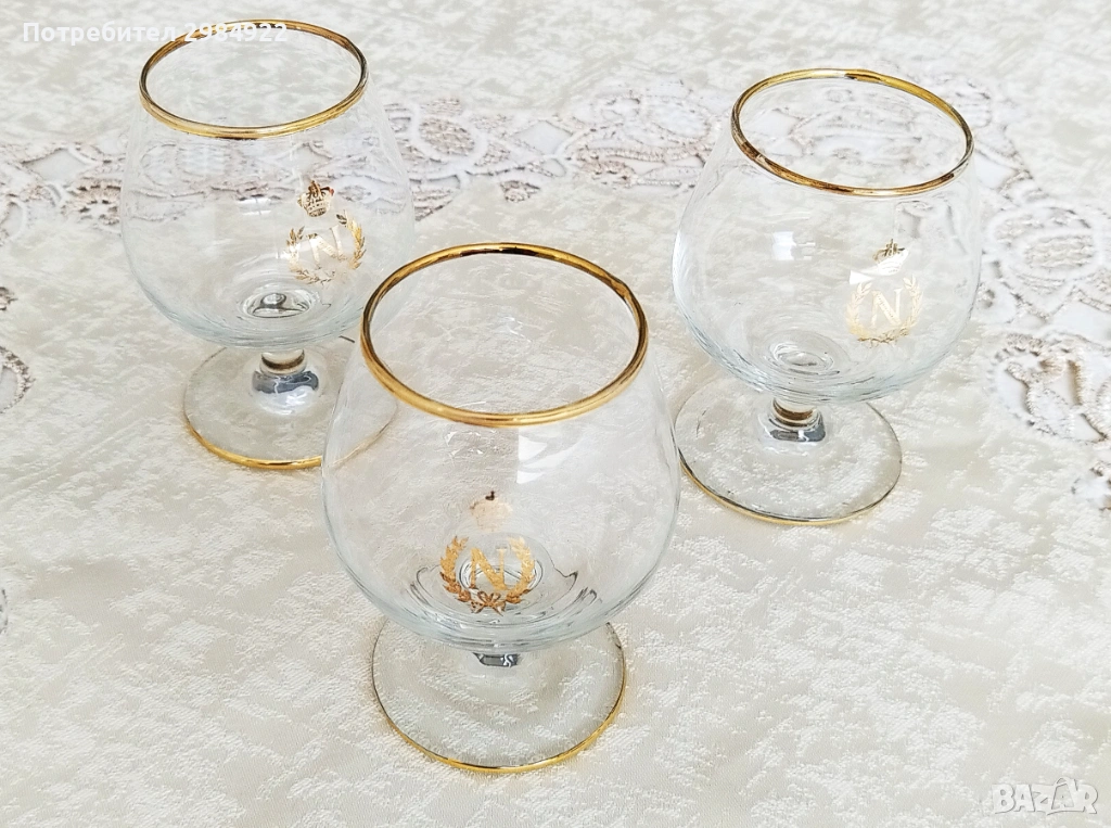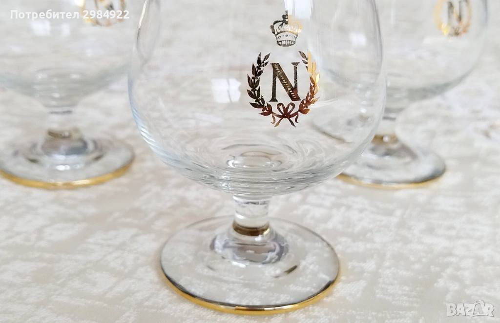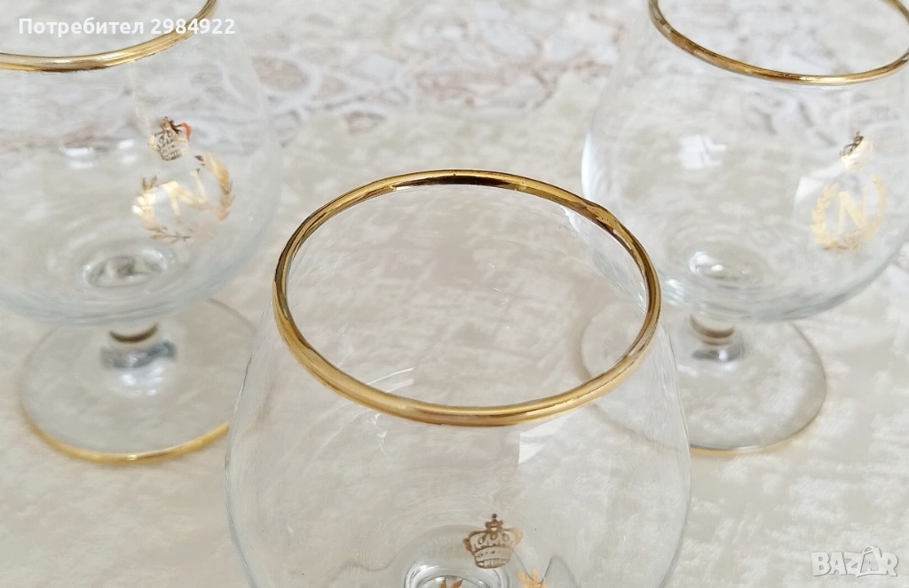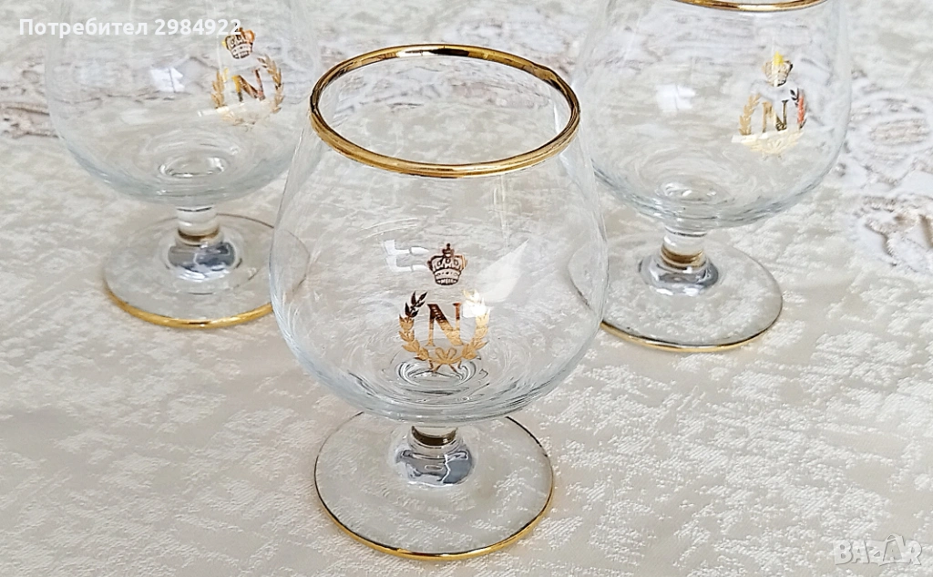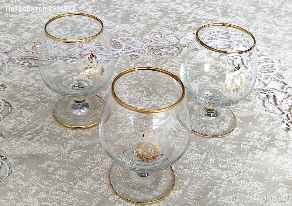 ВИНТИДЖ ЧАШИ ЗА БРЕНДИ НАПОЛЕОН С ДЪБКА И ЗЛАТНО ЛОГО "N" С КОРОНА В БАЛОННА ФОРМА, 3 бр. → Обява 53449826