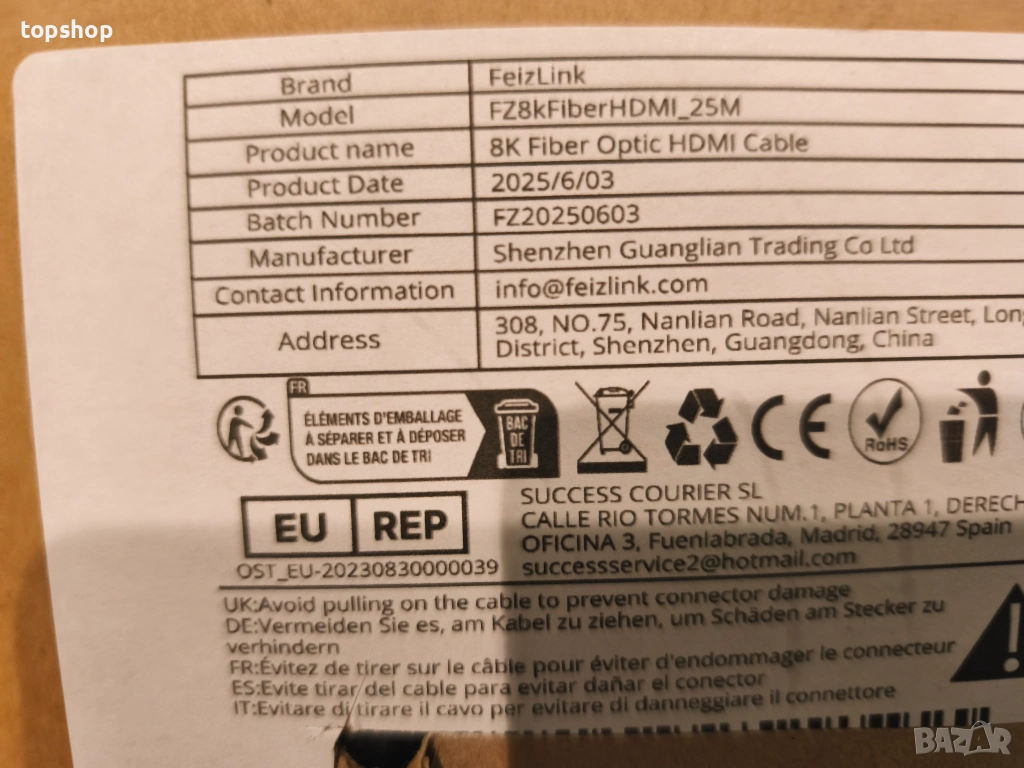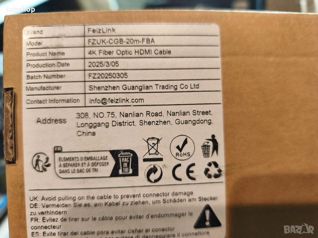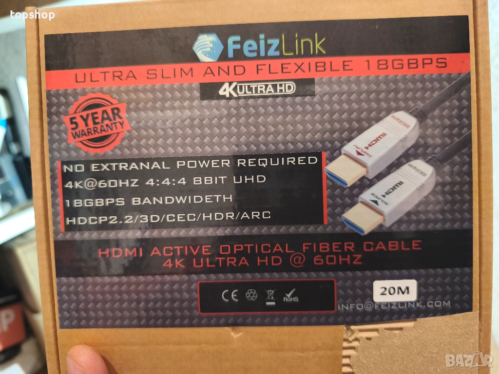 Чисто нов запечатан 8K Оптичен HDMI 2.1 Кабел FeizLink – 20 метра (4K/120Hz, 48Gbps)