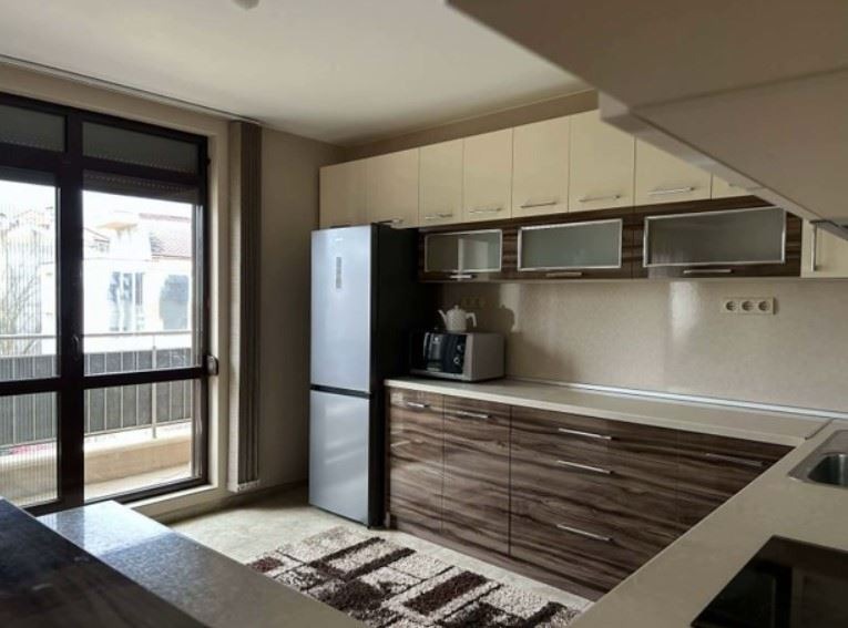 Имотът е обзаведен, с площ 103 кв.м, на 3-ти от 4 етажа в сграда с асансьор. Разпределението включва просторна дневна с кухня и трапезария, две спални, две бани с тоалетна и тераса.