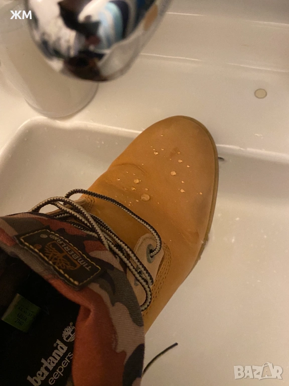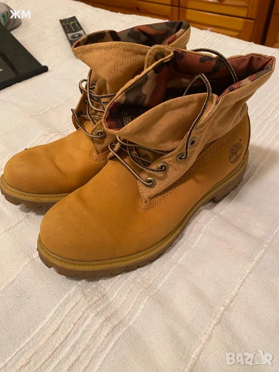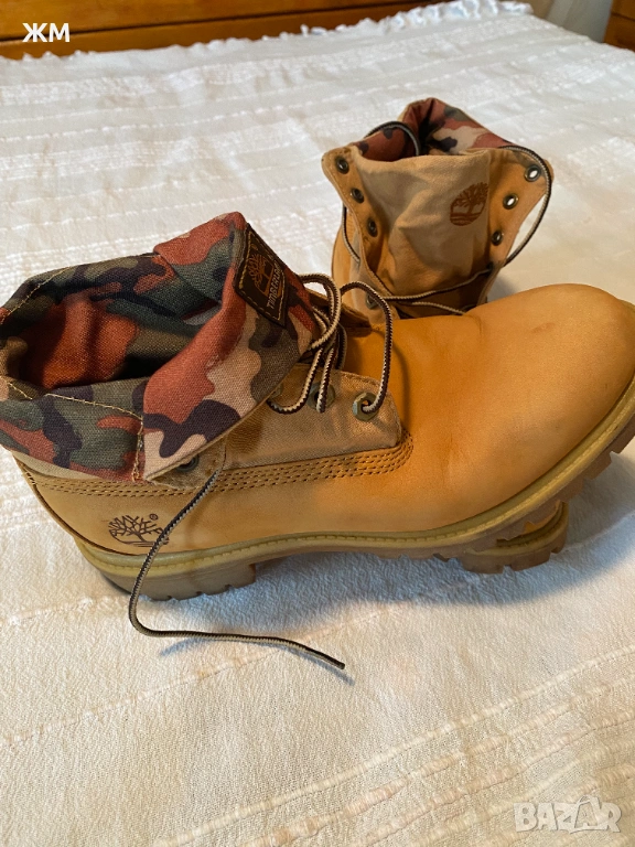 Оригинални обувки Timberland в класическия им жълт цвят, с камуфлажен подплатен борд около глезена. Roll top моделите са по-рядко срещани и може да се носят по два начина. Имам такива от вече 13 години.