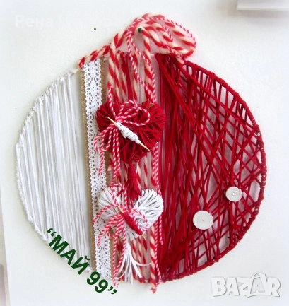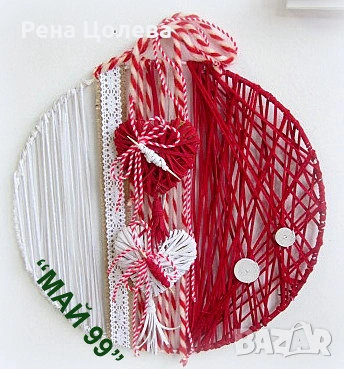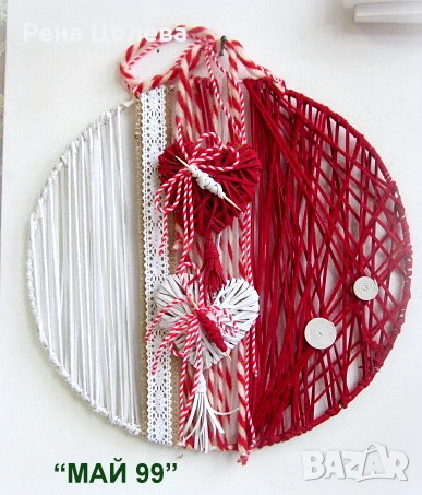 Пано /мартеница за баба Марта ф 30 см. на основа метален обръч, обвит двустранно с ленти от кожа и прежда /бяла и червена/,преплетени сърца от кожа и пресукана прежда мартеница!
