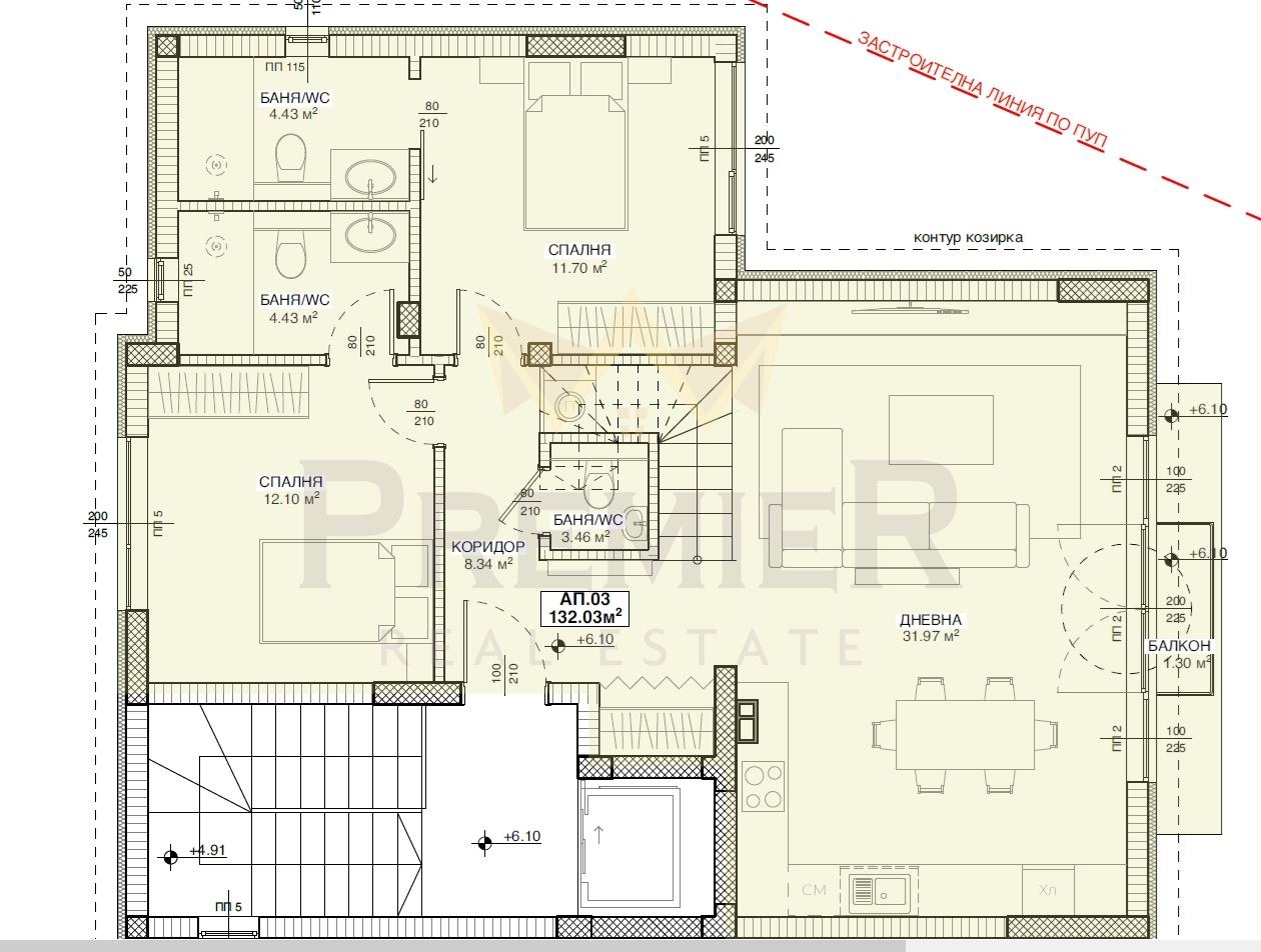 Конкретният апартамент се намира на трети и четвърти жилищен етаж като е с прилежащи панорамни тераси с размер над 100 м2.