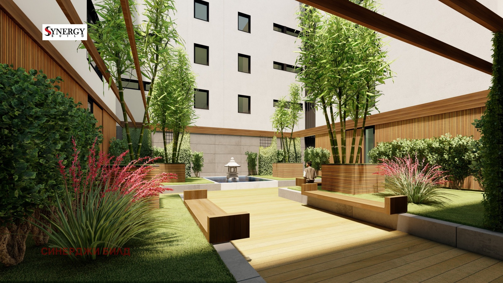 На разположение на новите собственици ще е уникален АТРИУМ / отворено дворно пространство, разположено в централната част на сградата / богато озеленен с място за отдих и воден кът.