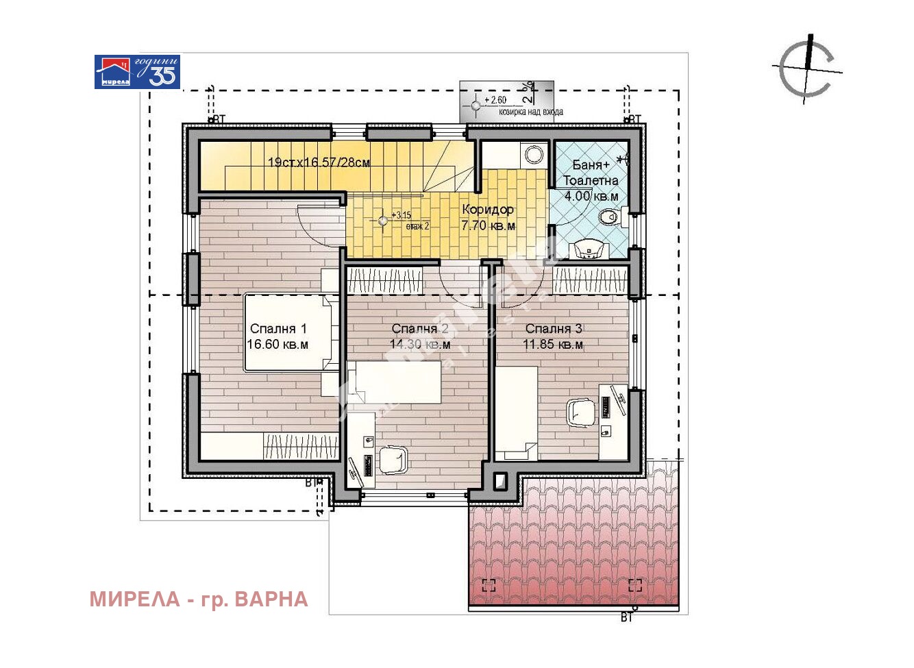 * ВТОРИ ЕТАЖ: коридор, три спални с правилни форми, баня с тоалетна и обособена ниша за пералня практично и добре премислено решение.