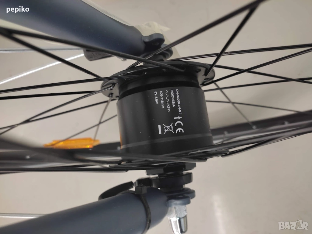 НОВ алуминиев градски велосипед BTWIN HOPRIDER 100 28 цола,супер лека алуминиева рамка от хидроформовани тръби 28 цола с 21 скорости,фиксирани превключватели MICROSHIFT 3 X 7,средно движение касета,алуминиеви курбели,пластмасови педали,пластмасов цял предпазител на багажника,преден отклонител SHIMANO TOURNEY,заден отклонител SHIMANO ALTUS,задни венци SHIMANO касета,задна алуминиева главина,предна динамо главина SHIMANO NEXUS 3,пластмасови калници,алуминиев багажник,алуминиево колче на седалката,алуминиево кормило,алуминиеви двойностенни усилени капли,емайлирани спици,гуми с безшумен грайфер КЕНДА 28 х 1,75,предна и задна вибрейк спирачки,осветление от пред и от зад с динамо главина,размер на рамката 47 х 59 см,тегло 13,9 кг. повече инфо на