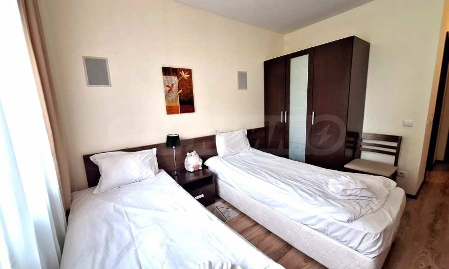 Кухнята е напълно обзаведена и оборудвана със стъкло-керамичен плот, вградена фурна, абсорбатор, вграден хладилник, пералня, електрическа кана за вода, мивка, шкафове за инвентар и посуда, маса за хранене; холът е с двуместен, разтегателен диван, масичка за кафе, телевизор и шкафче за него; едната спалня е с двойно легло с матрак, нощни шкафчета, гардероб и собствена баня с вана и тоалетна; втората спалня е с две единични легла, нощни шкафчета, гардероб и собствена баня с душ кабина и тоалетна.
