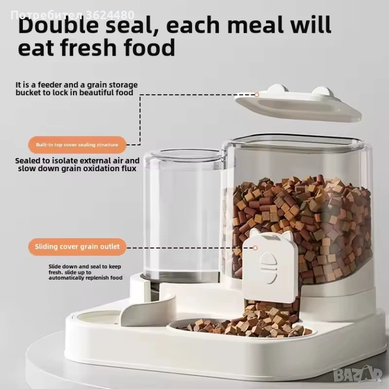 1 х Прозрачен диспенсър (резервоар) за суха храна.