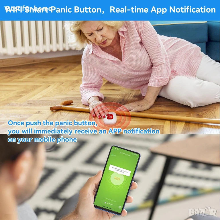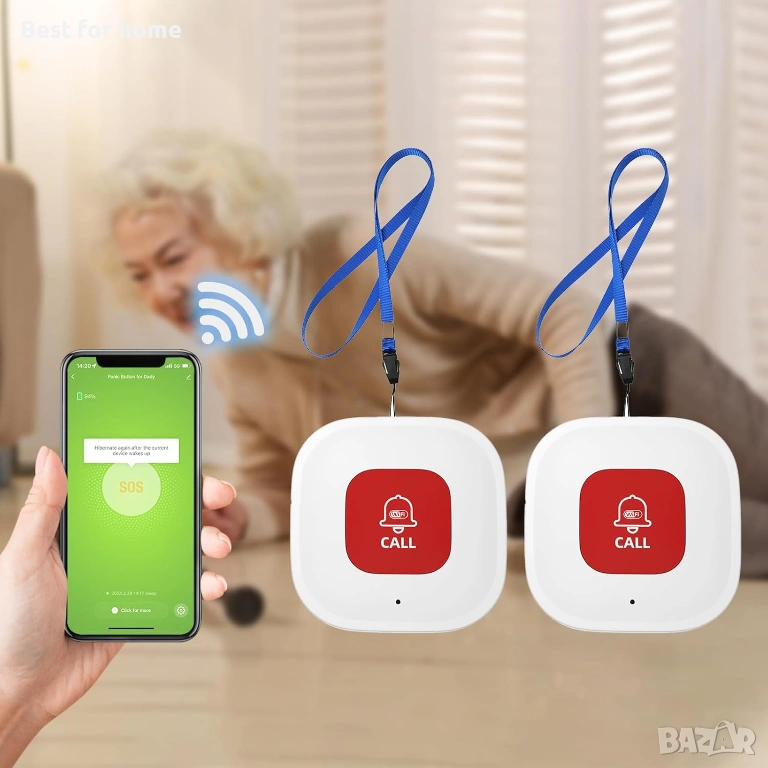 Комплект от 2 WiFi бутона за повикване на болногледач за възрастни хора у дома с известяване от приложение, наблюдение на възрастни хора, пейджър за болногледач, системи за предупреждение за възрастни хора без месечна такса, бутон за предупреждение за възрастни хора у дома.