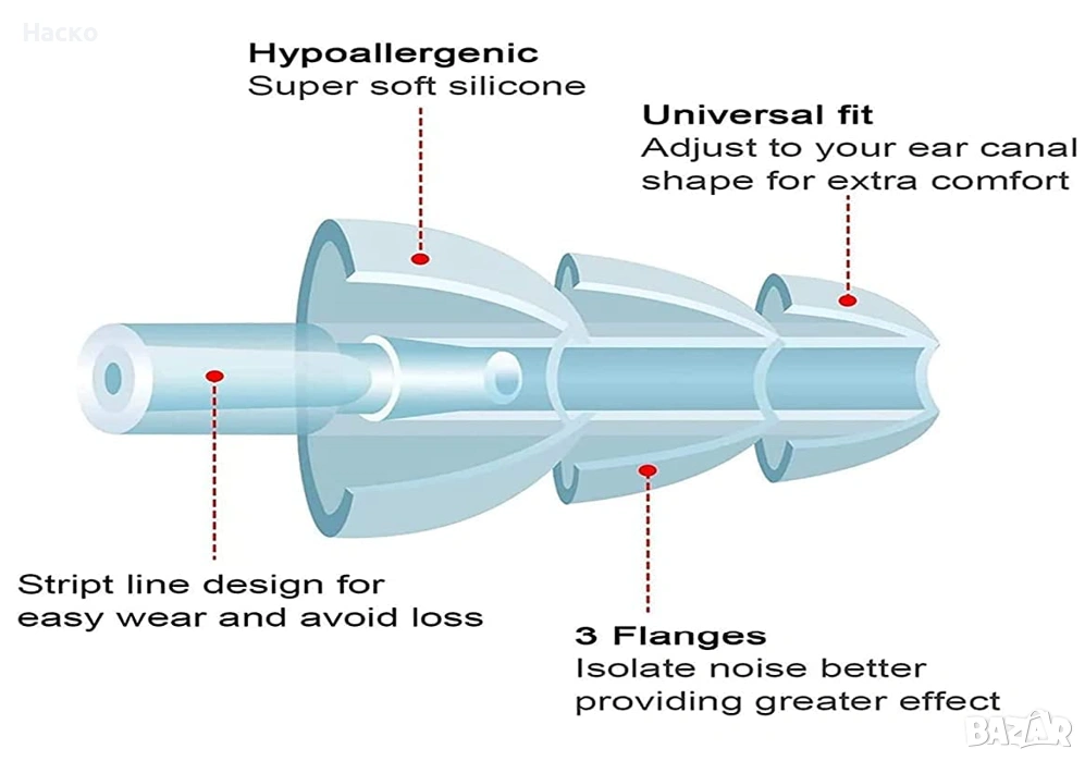 В комплекта са включени 6 чифта (12 броя) тапи за уши с