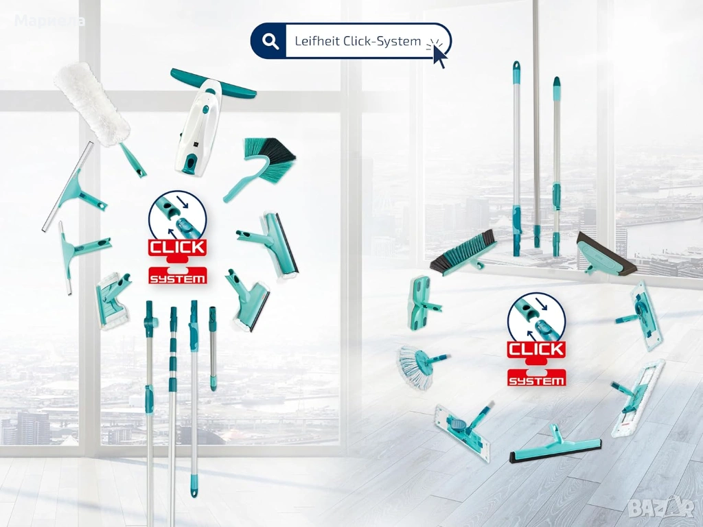 Click система - Дръжката е с патентованата Leifheit Click система - благодарение на специалното закрепване, обхватът на чистачката за прозорци може лесно да се удължи.
