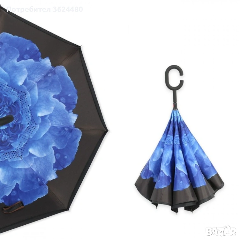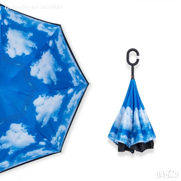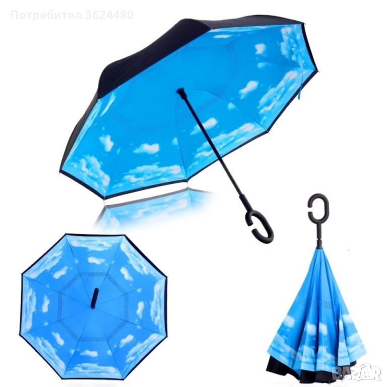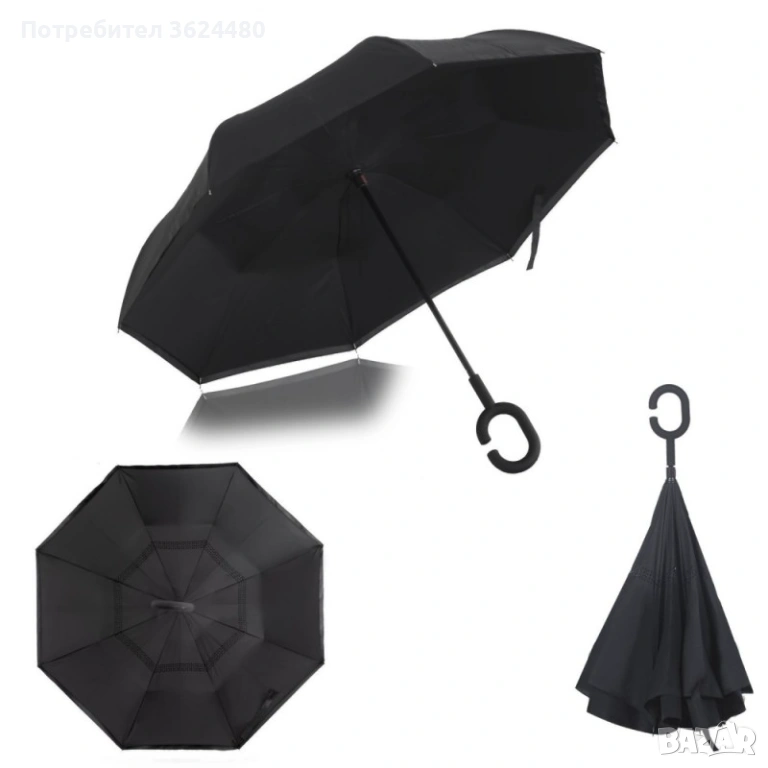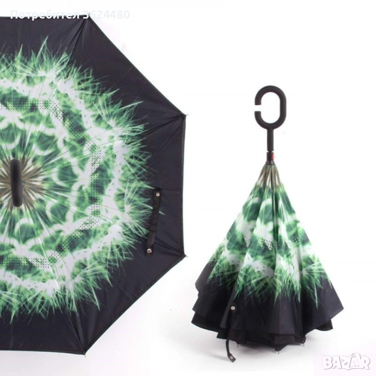 Чадър с обратно затваряне по-добрият чадър! Двупластов чадър, затварящ се на обратно с повърхност от полиестер, метални спици и дръжка от каучук. Обратното затваряне е много по-логично, тъй като така не се мокрите в дъждовните дни, особено като излизате например от колата, докато го отваряте или пък не мокрите своя дом като се приберете, тъй като благодарение на обратното затваряне (противоположно на обикновените чадъри) – водата остава в него.