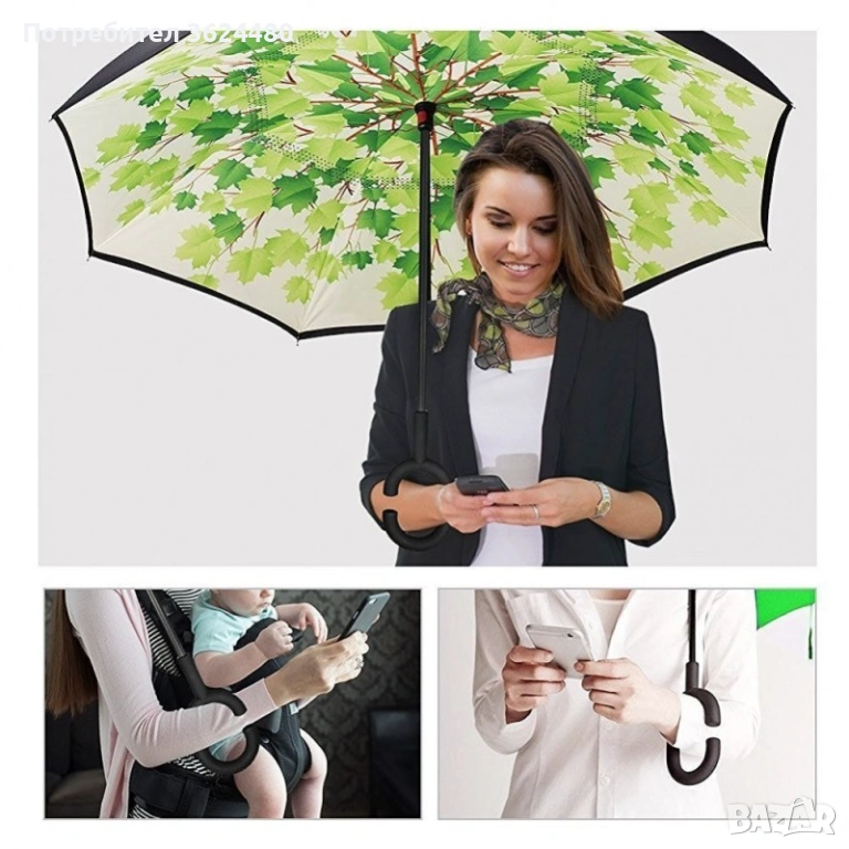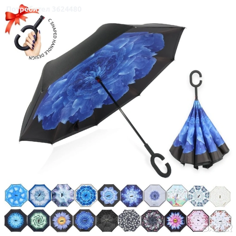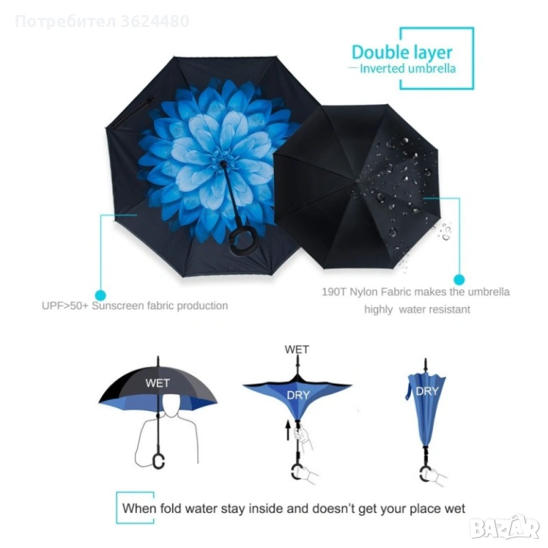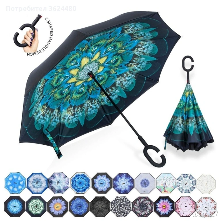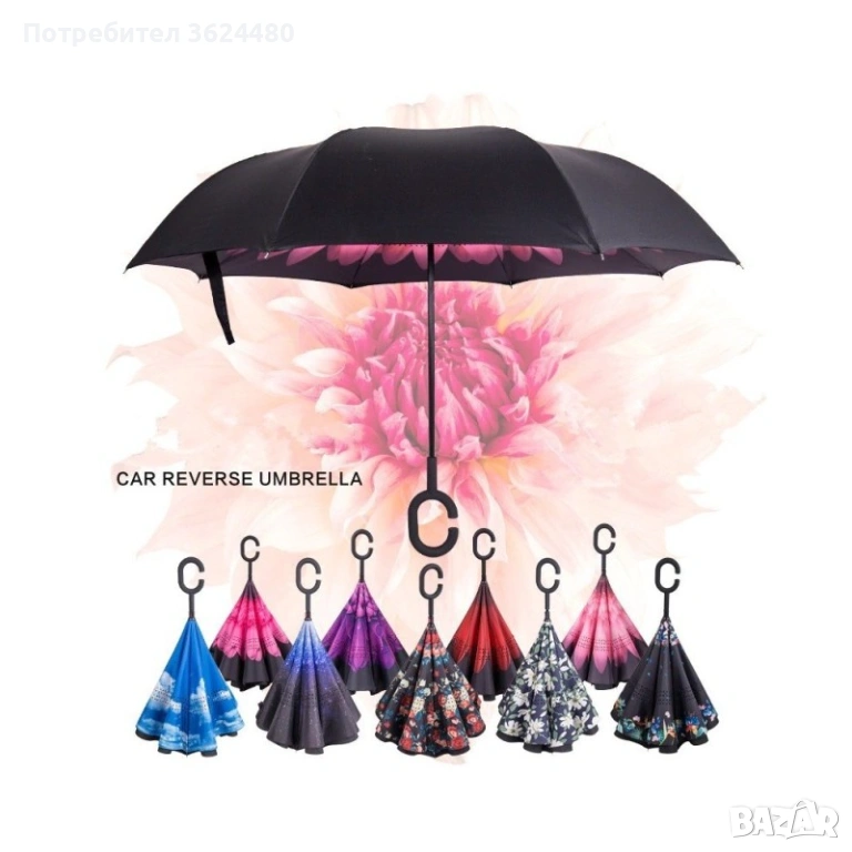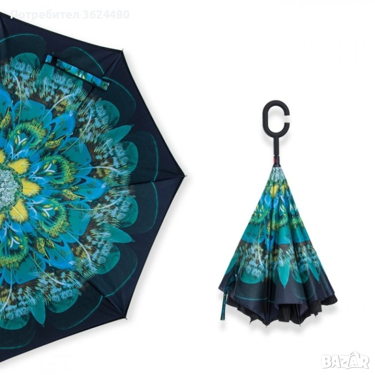 Чадър с обратно затваряне по-добрият чадър! Двупластов чадър, затварящ се на обратно с повърхност от полиестер, метални спици и дръжка от каучук. Обратното затваряне е много по-логично, тъй като така не се мокрите в дъждовните дни, особено като излизате например от колата, докато го отваряте или пък не мокрите своя дом като се приберете, тъй като благодарение на обратното затваряне (противоположно на обикновените чадъри) – водата остава в него.