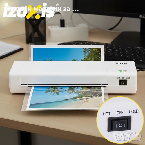 IZOXIS 4в1 500W ламинатор за фолио - бързо A4 нагряване на топло и студено - вграден тример и заобличащ ъгъл + 60 фолиа за начало.