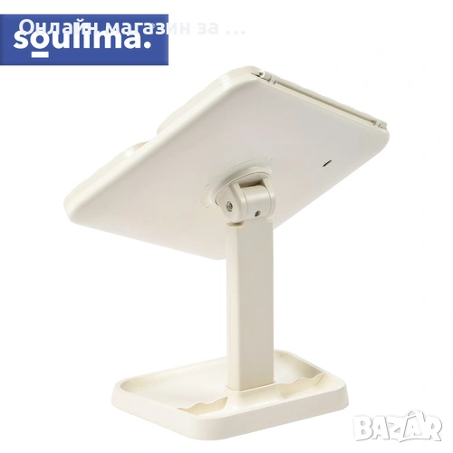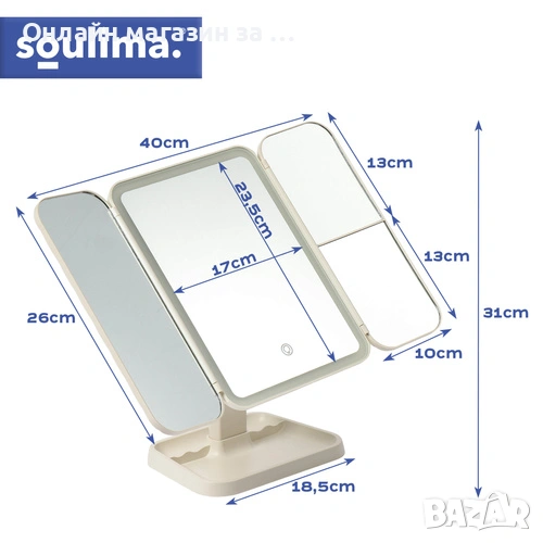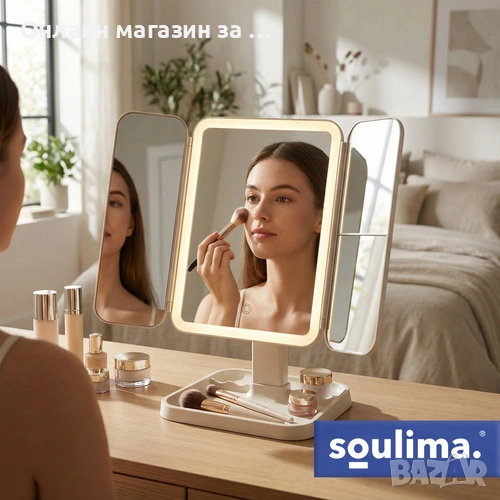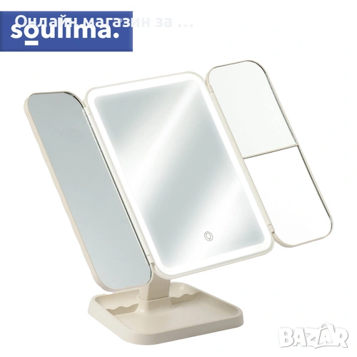 Елегантното LED козметично огледало Soulima превръща обикновената тоалетка в малко студио за красота. Тричастният, разгъваем дизайн с централно огледало и две крила ви позволява да виждате лицето и прическата си от различни ъгли, а страничният панел с увеличение улеснява прецизните корекции. Вграденото LED осветление с регулируема цветна температура осигурява комфортно гримиране и грижа за кожата, дори в по-тъмни стаи. Кремаво-бял цвят и диамантено-капитониран преден панел придават стил, а когато е сгънато, огледалото прилича на стилен защитен калъф. Компактните му размери 21 x 13,5 x 31 cm го правят идеален за тоалетка, шкаф или бюро. Вградена батерия 600 mAh, зареждаща се чрез USB-C, позволява удобна употреба без заплитане на кабела.