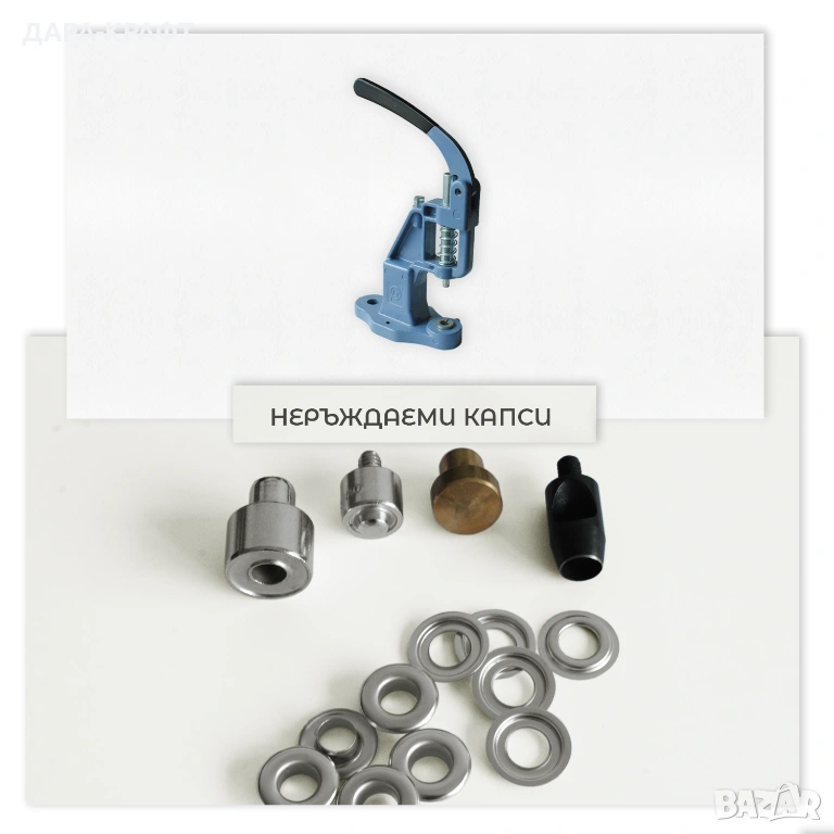 Комплект от инструменти за поставяне на капси. Включва: комбинирана ръчна преса (машина), матрица за капси, замба + месингова подложка и 100, 300 или 500 бр капси с шайби от неръждаема стомана