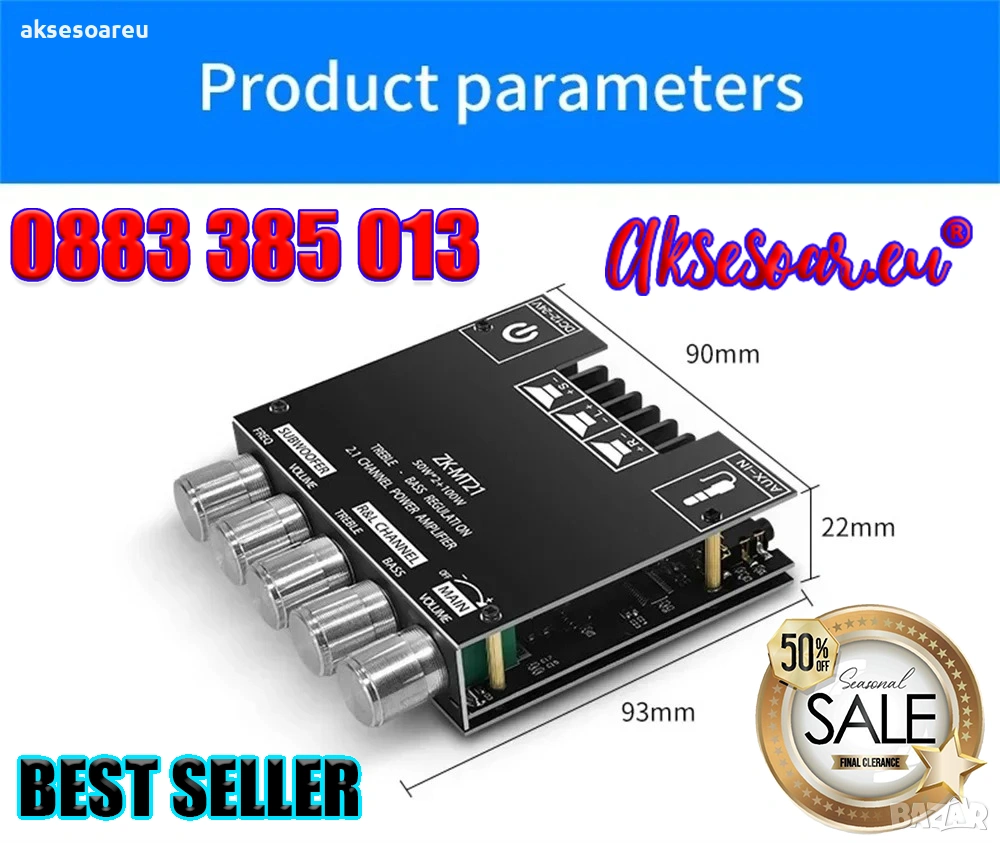 Нов Аудио Стерео Bluetooth 5.0 цифров усилвател клас D на Платка с мощност 2x50W+100W 2.1 канален субуфер AUX 12V