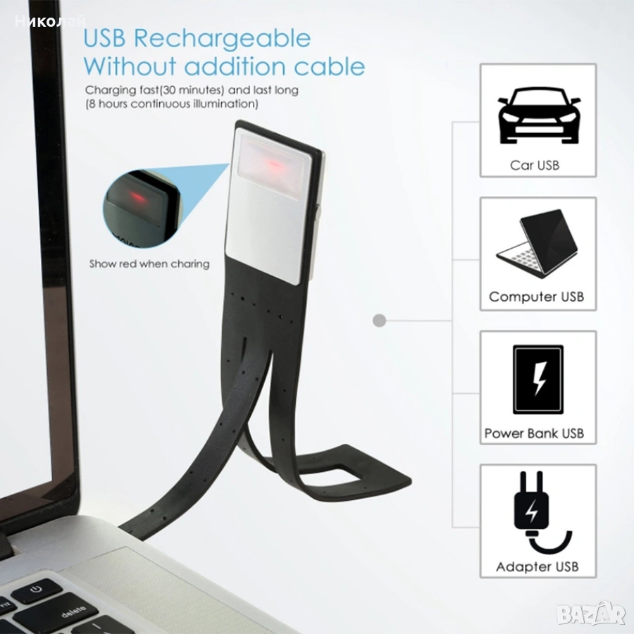 Зареждане - 30 минути, използване до 8 часа.