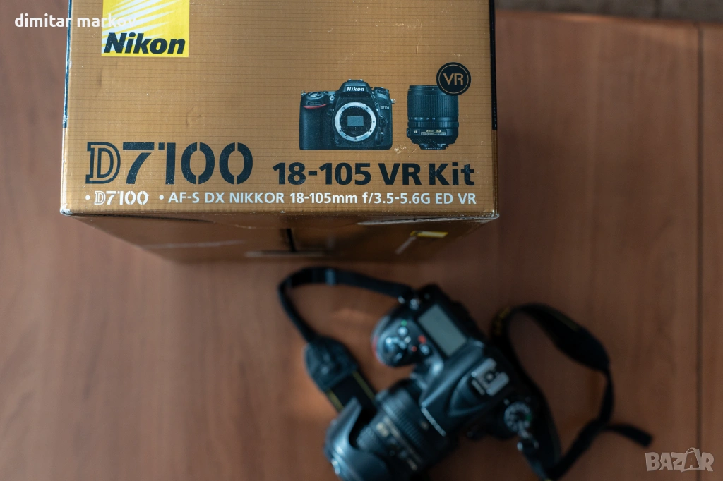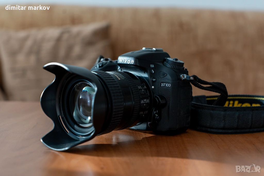 Никон D7100 DSLR с две батерии, зарядно и кутия. Апарата е с нормалнои следи от употреба. Обектива AF-S DX Nikkor 16-85mm f/3.5-5.6G ED VR е с много добра стабилизация от второ поколение което помага при ниски скорости или при по-голяма дължина. Забележка има само по предната гумена обвивка на обектива, където се зумва. Продават се за поняколко лева тези гумички. Светкавицата работи отлично, достатъчно мощна е за нощни снимки, тя работи с 4 батерия АА.