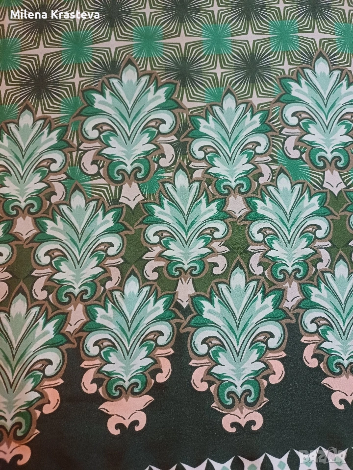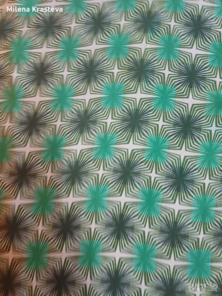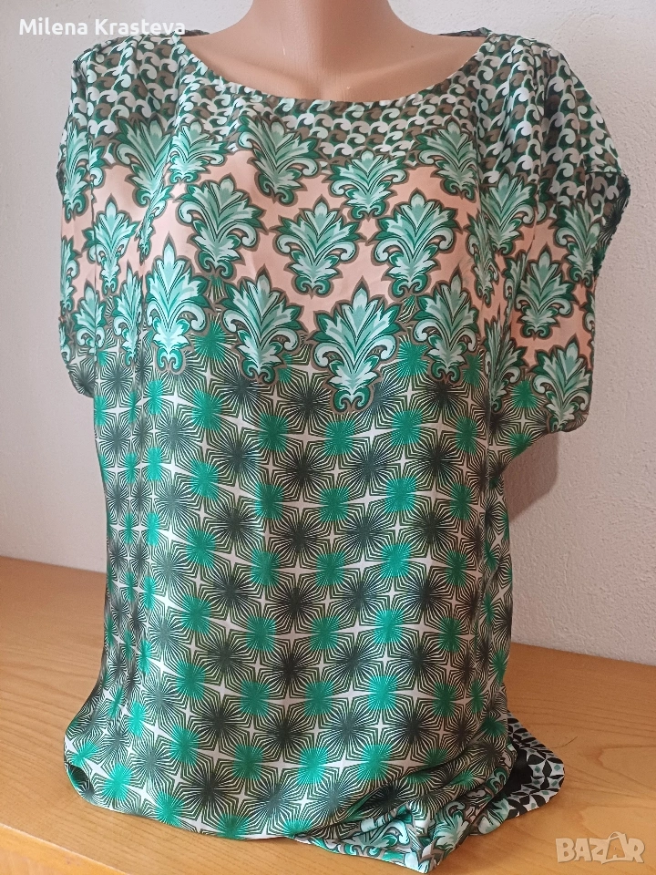 Лека ефирна материя. Паднал ръкав къс. Принтът е ясен отчетлив с форми подчертаващи тялото.