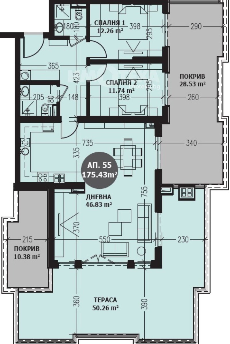Тристаен апартамент със ЗП: 102.77 кв.м., общи части: 22.40 кв.м., тераса: 50.26 кв.м., състоящ се от прекрасна дневна с кухненски бокс, две спални, две бани с тоалетни. Изложението на имота е изток.