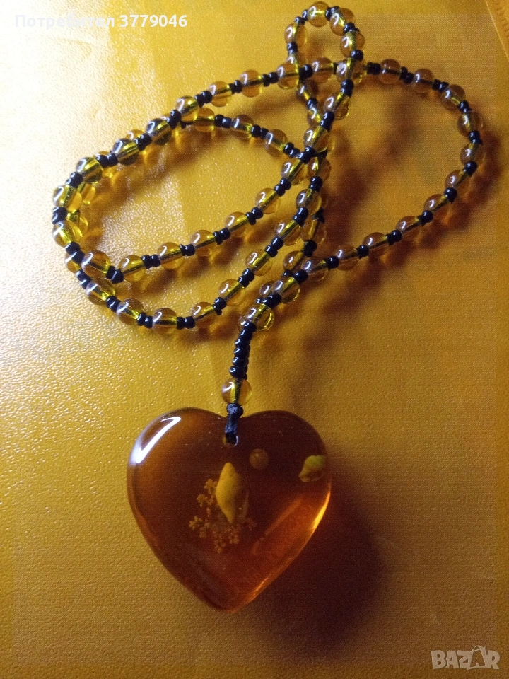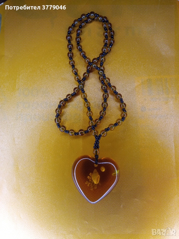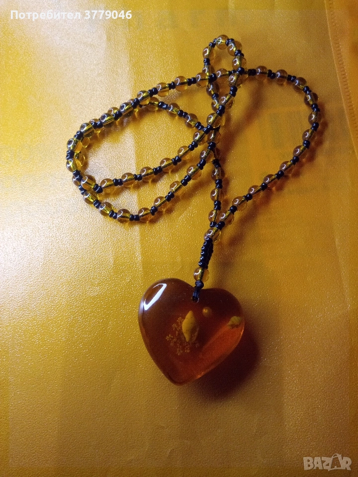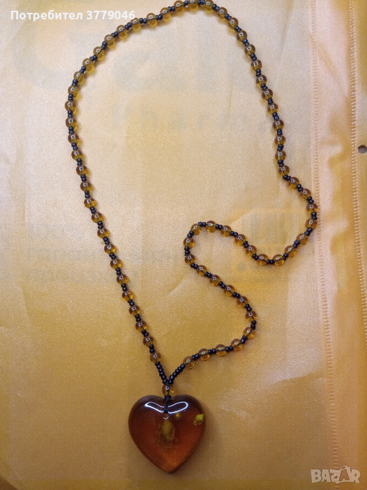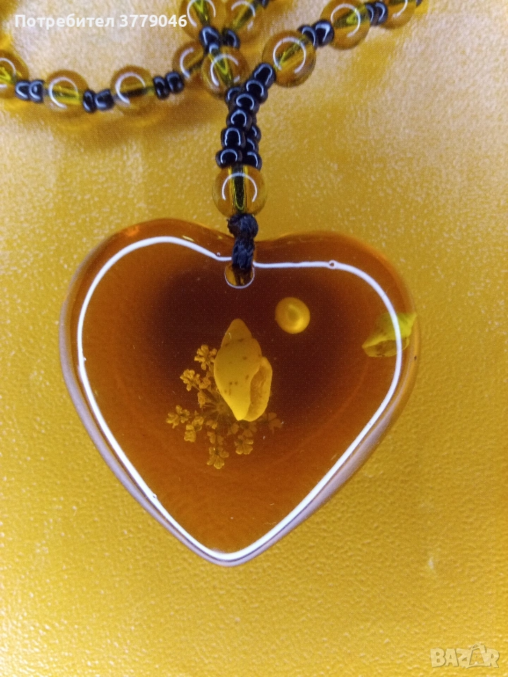 Медальон с кехлибар Висулка с форма на сърце. В него има рапанчета, цвете и перличка. Размери на сърцето 4 см на 3,5 см. Дължина на медальона 65 см.