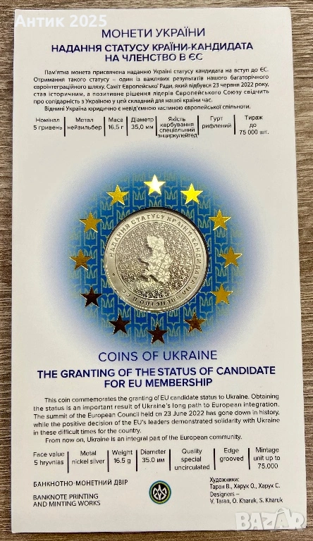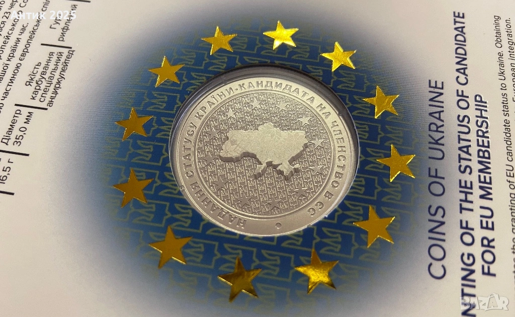 Официална паметна монета на Националната банка на Украйна, посветена на историческото събитие – предоставянето на Украйна на статут на страна кандидат за членство в Европейския съюз (23 юни 2022 г.).