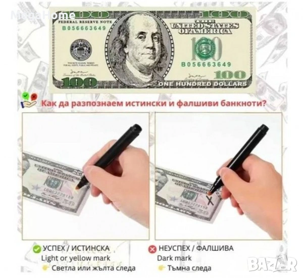 - Ако мастилото потъмнее и цветът стане наситен, това е сигурен знак, че парите не са истински. Обратно, ако цветът е бледо жълт, то тогава всичко е наред. След около две-три минути чертата напълно ще изчезне и няма да остане никаква следа.