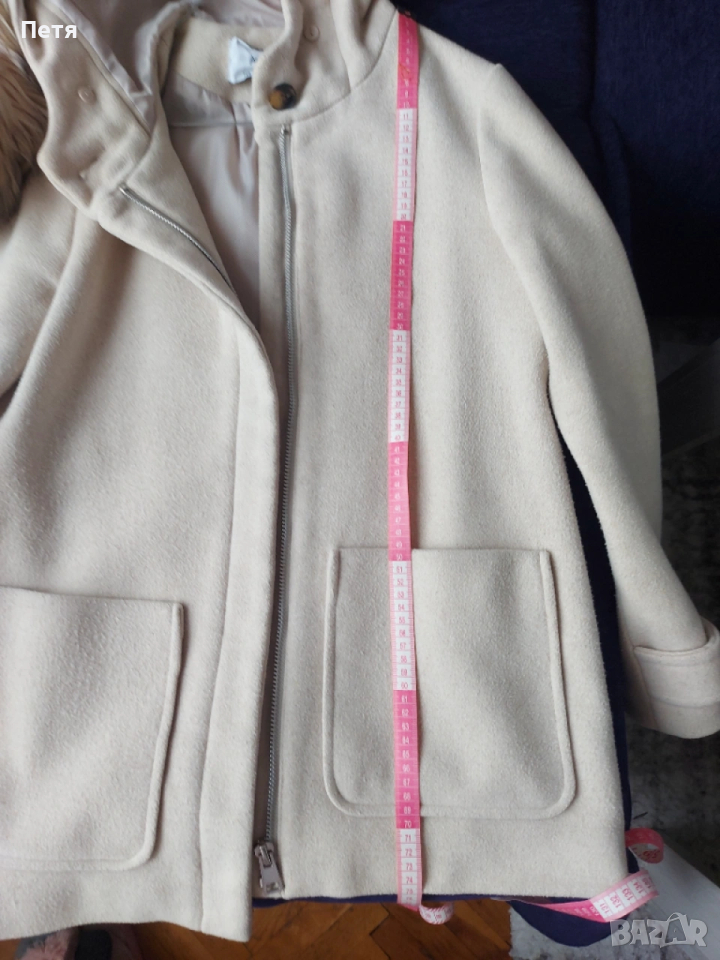 Палтото е светло бежово. След химическо чистене е, без забележки. Без петна, без скъсано, работещ здрав цип. Има допълнително пухче, което се сваля. По етикет е С размер, но става и за М размер. Купувано е за 140 лв.