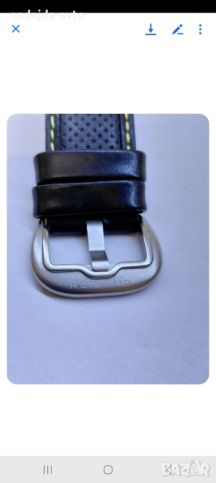китката са трудни за обяснение поради дизайна на корпуса, който варира между 46мм и 49мм. Допълнително комфорт придава начинът, по който се закрепва каишката, минавайки под часовника през дъговидни, непрекъснати лъгове. Каишката е широка черна кожа със жълт конец и масивна тока с лого. Часовникът е без кутия и документи. Кожената каишка има леки забележки, което ще бъде отразено в цената.