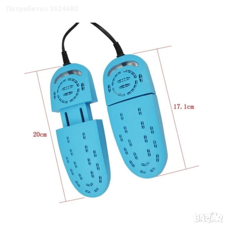 Този универсален уред за сушене на обувки ефективно отстранява влагата и защитава обувките ви, като не допуска образуването на мухал и плесен. Размерът и формата на изсушителя са универсални и могат да се използват при различни размери и видове обувки. Сешоарът за обувки аботи с минимална електрическа консумация на 220V захранване.