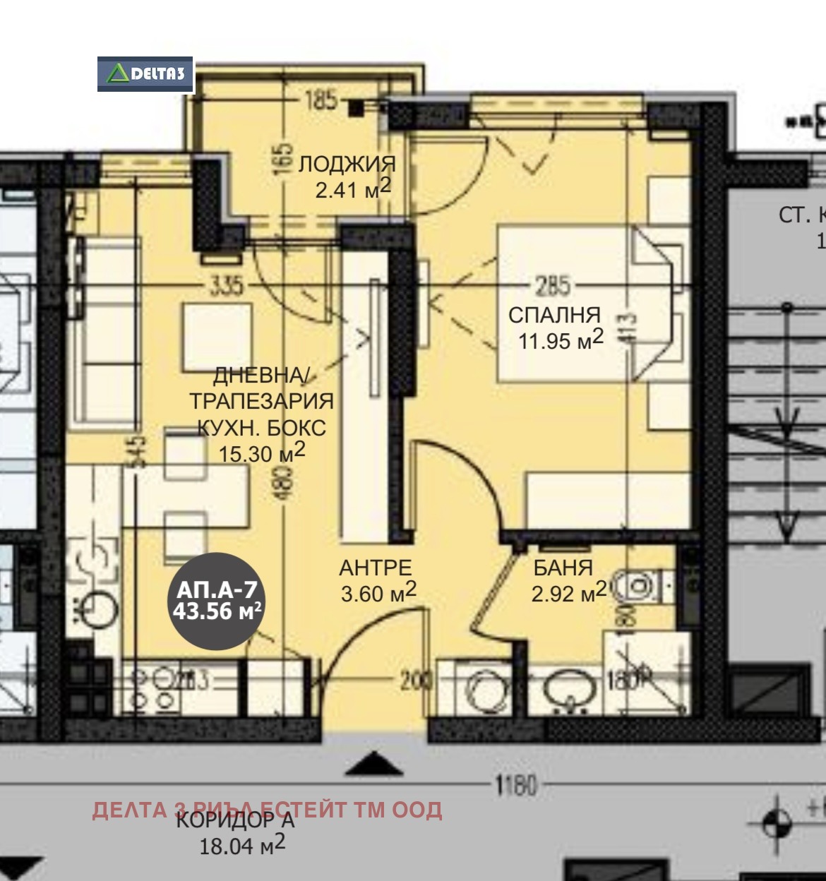 Жилището разполага с входно антре, дневна с кухненски бокс, спалня, баня с тоалетна и балкон.