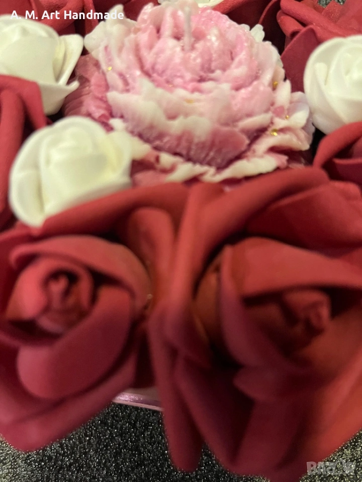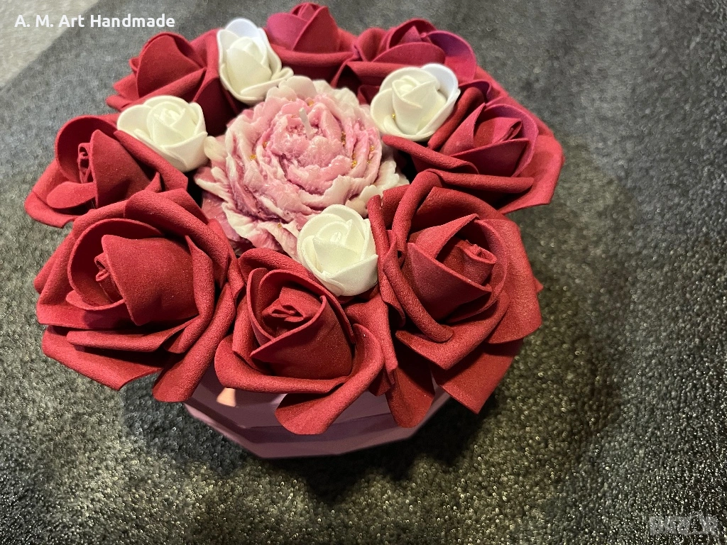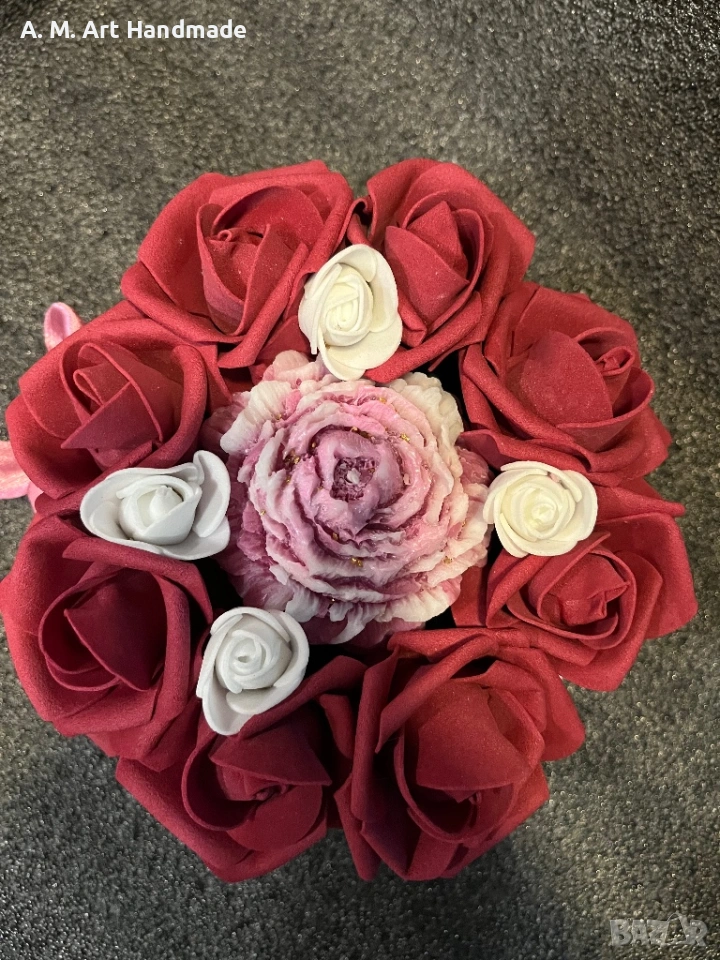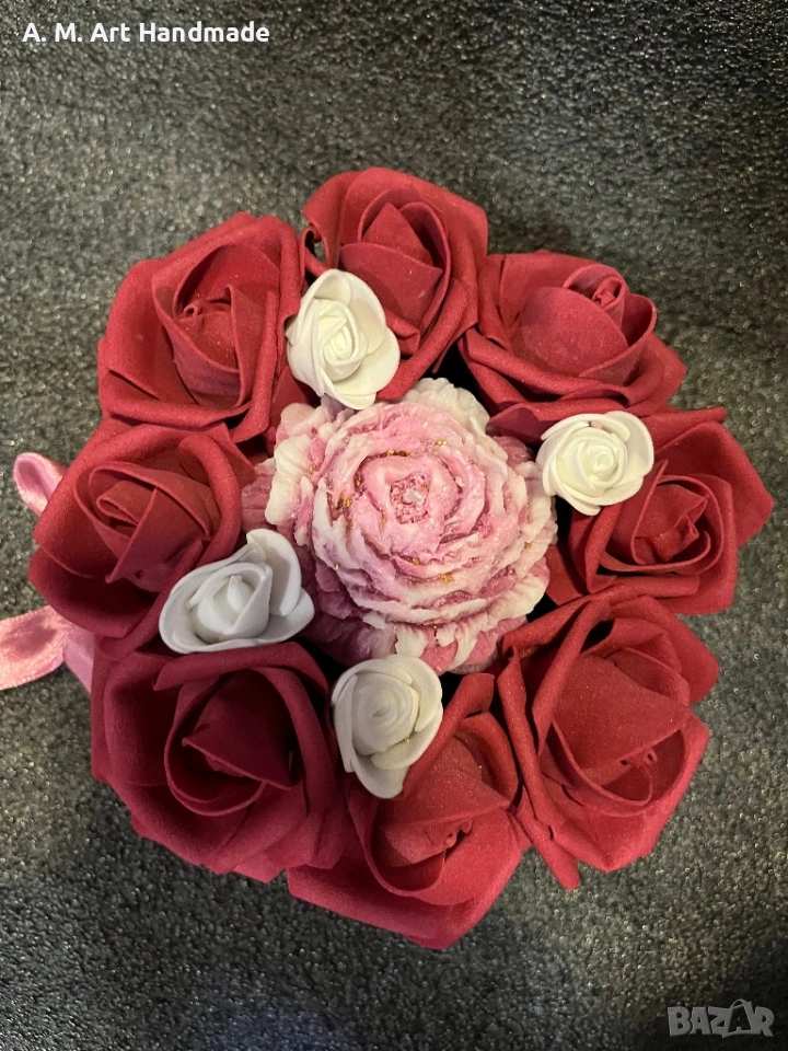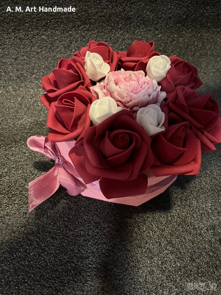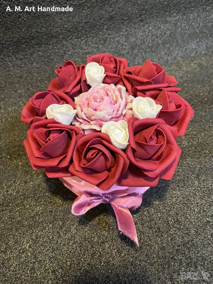 • 🌹 Детайли: Вечни рози и централен божур със златни акценти.