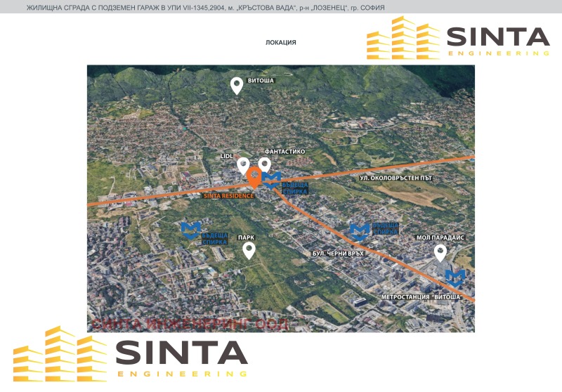 ЖИЛИЩНА СГРАДА с подземни гаражи и паркоместа. ПРОДАЖБА на апартаменти в жил.сграда SINTA RESIDENCE, която се намира в бързо развиващ се район на София - м.Кръстова вада, р-н Лозенец, ул.Лилия Гюлева. Със атрактивно местоположение, бърз достъп до различните точки на града. В района ще откриете големи супермаркети Фантастико, Лидл и магазин Зора. В близост се намира и Аджибадем Сити Клиник - УМБАЛ Сърдечно-съдов център.